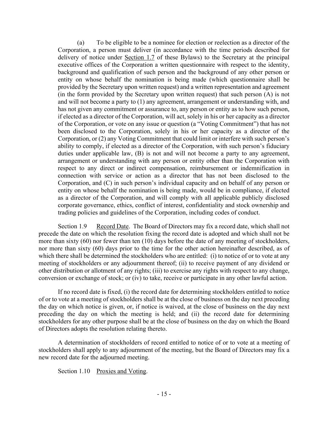 - 15 - (a) To be eligible to be a nominee for election or reelection as a director of the Corporation, a person must deliver (in accordance with the time periods described for delivery of notice under Section 1.7 of these Bylaws) to the Secretary at the principal executive offices of the Corporation a written questionnaire with respect to the identity, background and qualification of such person and the background of any other person or entity on whose behalf the nomination is being made (which questionnaire shall be provided by the Secretary upon written request) and a written representation and agreement (in the form provided by the Secretary upon written request) that such person (A) is not and will not become a party to (1) any agreement, arrangement or understanding with, and has not given any commitment or assurance to, any person or entity as to how such person, if elected as a director of the Corporation, will act, solely in his or her capacity as a director of the Corporation, or vote on any issue or question (a “Voting Commitment”) that has not been disclosed to the Corporation, solely in his or her capacity as a director of the Corporation, or (2) any Voting Commitment that could limit or interfere with such person’s ability to comply, if elected as a director of the Corporation, with such person’s fiduciary duties under applicable law, (B) is not and will not become a party to any agreement, arrangement or understanding with any person or entity other than the Corporation with respect to any direct or indirect compensation, reimbursement or indemnification in connection with service or action as a director that has not been disclosed to the Corporation, and (C) in such person’s individual capacity and on behalf of any person or entity on whose behalf the nomination is being made, would be in compliance, if elected as a director of the Corporation, and will comply with all applicable publicly disclosed corporate governance, ethics, conflict of interest, confidentiality and stock ownership and trading policies and guidelines of the Corporation, including codes of conduct. Section 1.9 Record Date. The Board of Directors may fix a record date, which shall not precede the date on which the resolution fixing the record date is adopted and which shall not be more than sixty (60) nor fewer than ten (10) days before the date of any meeting of stockholders, nor more than sixty (60) days prior to the time for the other action hereinafter described, as of which there shall be determined the stockholders who are entitled: (i) to notice of or to vote at any meeting of stockholders or any adjournment thereof; (ii) to receive payment of any dividend or other distribution or allotment of any rights; (iii) to exercise any rights with respect to any change, conversion or exchange of stock; or (iv) to take, receive or participate in any other lawful action. If no record date is fixed, (i) the record date for determining stockholders entitled to notice of or to vote at a meeting of stockholders shall be at the close of business on the day next preceding the day on which notice is given, or, if notice is waived, at the close of business on the day next preceding the day on which the meeting is held; and (ii) the record date for determining stockholders for any other purpose shall be at the close of business on the day on which the Board of Directors adopts the resolution relating thereto. A determination of stockholders of record entitled to notice of or to vote at a meeting of stockholders shall apply to any adjournment of the meeting, but the Board of Directors may fix a new record date for the adjourned meeting. Section 1.10 Proxies and Voting.