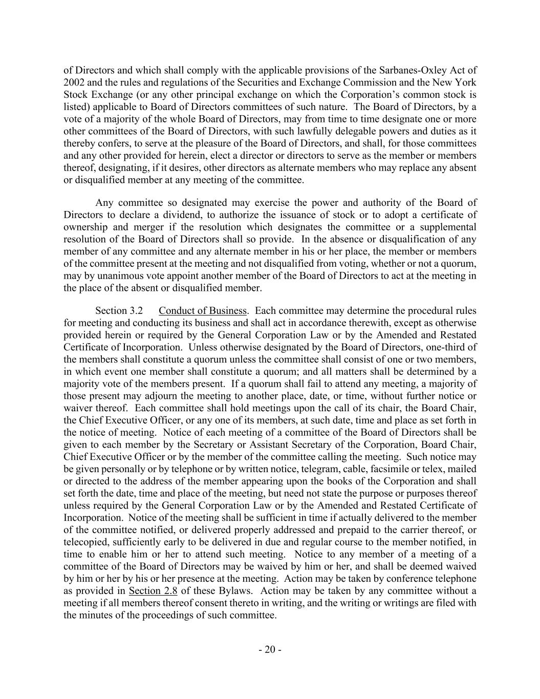 - 20 - of Directors and which shall comply with the applicable provisions of the Sarbanes-Oxley Act of 2002 and the rules and regulations of the Securities and Exchange Commission and the New York Stock Exchange (or any other principal exchange on which the Corporation’s common stock is listed) applicable to Board of Directors committees of such nature. The Board of Directors, by a vote of a majority of the whole Board of Directors, may from time to time designate one or more other committees of the Board of Directors, with such lawfully delegable powers and duties as it thereby confers, to serve at the pleasure of the Board of Directors, and shall, for those committees and any other provided for herein, elect a director or directors to serve as the member or members thereof, designating, if it desires, other directors as alternate members who may replace any absent or disqualified member at any meeting of the committee. Any committee so designated may exercise the power and authority of the Board of Directors to declare a dividend, to authorize the issuance of stock or to adopt a certificate of ownership and merger if the resolution which designates the committee or a supplemental resolution of the Board of Directors shall so provide. In the absence or disqualification of any member of any committee and any alternate member in his or her place, the member or members of the committee present at the meeting and not disqualified from voting, whether or not a quorum, may by unanimous vote appoint another member of the Board of Directors to act at the meeting in the place of the absent or disqualified member. Section 3.2 Conduct of Business. Each committee may determine the procedural rules for meeting and conducting its business and shall act in accordance therewith, except as otherwise provided herein or required by the General Corporation Law or by the Amended and Restated Certificate of Incorporation. Unless otherwise designated by the Board of Directors, one-third of the members shall constitute a quorum unless the committee shall consist of one or two members, in which event one member shall constitute a quorum; and all matters shall be determined by a majority vote of the members present. If a quorum shall fail to attend any meeting, a majority of those present may adjourn the meeting to another place, date, or time, without further notice or waiver thereof. Each committee shall hold meetings upon the call of its chair, the Board Chair, the Chief Executive Officer, or any one of its members, at such date, time and place as set forth in the notice of meeting. Notice of each meeting of a committee of the Board of Directors shall be given to each member by the Secretary or Assistant Secretary of the Corporation, Board Chair, Chief Executive Officer or by the member of the committee calling the meeting. Such notice may be given personally or by telephone or by written notice, telegram, cable, facsimile or telex, mailed or directed to the address of the member appearing upon the books of the Corporation and shall set forth the date, time and place of the meeting, but need not state the purpose or purposes thereof unless required by the General Corporation Law or by the Amended and Restated Certificate of Incorporation. Notice of the meeting shall be sufficient in time if actually delivered to the member of the committee notified, or delivered properly addressed and prepaid to the carrier thereof, or telecopied, sufficiently early to be delivered in due and regular course to the member notified, in time to enable him or her to attend such meeting. Notice to any member of a meeting of a committee of the Board of Directors may be waived by him or her, and shall be deemed waived by him or her by his or her presence at the meeting. Action may be taken by conference telephone as provided in Section 2.8 of these Bylaws. Action may be taken by any committee without a meeting if all members thereof consent thereto in writing, and the writing or writings are filed with the minutes of the proceedings of such committee.