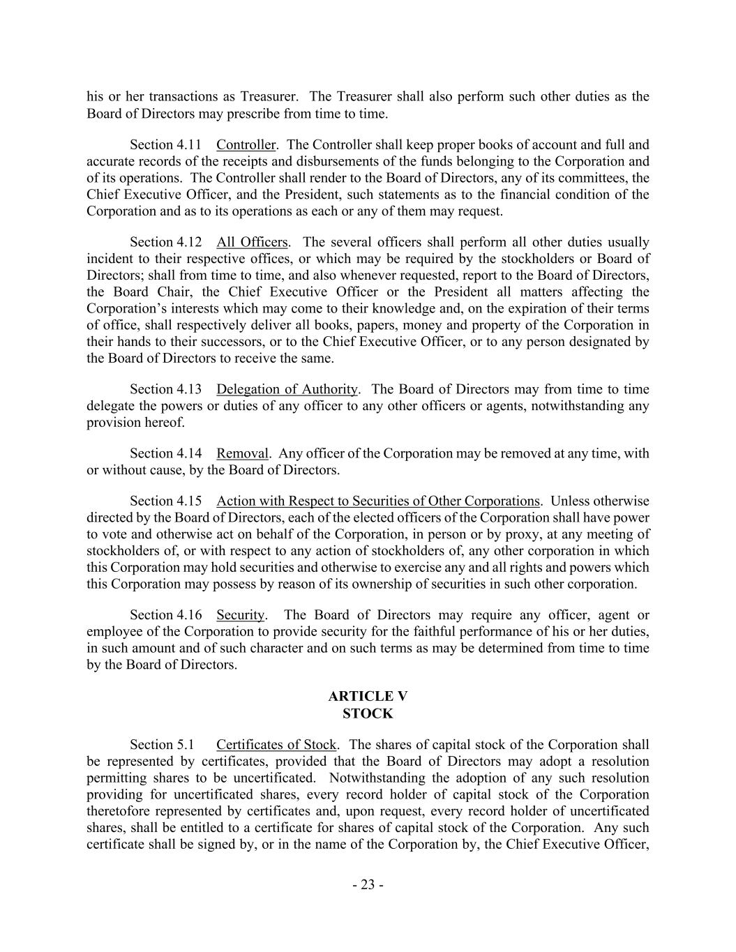 - 23 - his or her transactions as Treasurer. The Treasurer shall also perform such other duties as the Board of Directors may prescribe from time to time. Section 4.11 Controller. The Controller shall keep proper books of account and full and accurate records of the receipts and disbursements of the funds belonging to the Corporation and of its operations. The Controller shall render to the Board of Directors, any of its committees, the Chief Executive Officer, and the President, such statements as to the financial condition of the Corporation and as to its operations as each or any of them may request. Section 4.12 All Officers. The several officers shall perform all other duties usually incident to their respective offices, or which may be required by the stockholders or Board of Directors; shall from time to time, and also whenever requested, report to the Board of Directors, the Board Chair, the Chief Executive Officer or the President all matters affecting the Corporation’s interests which may come to their knowledge and, on the expiration of their terms of office, shall respectively deliver all books, papers, money and property of the Corporation in their hands to their successors, or to the Chief Executive Officer, or to any person designated by the Board of Directors to receive the same. Section 4.13 Delegation of Authority. The Board of Directors may from time to time delegate the powers or duties of any officer to any other officers or agents, notwithstanding any provision hereof. Section 4.14 Removal. Any officer of the Corporation may be removed at any time, with or without cause, by the Board of Directors. Section 4.15 Action with Respect to Securities of Other Corporations. Unless otherwise directed by the Board of Directors, each of the elected officers of the Corporation shall have power to vote and otherwise act on behalf of the Corporation, in person or by proxy, at any meeting of stockholders of, or with respect to any action of stockholders of, any other corporation in which this Corporation may hold securities and otherwise to exercise any and all rights and powers which this Corporation may possess by reason of its ownership of securities in such other corporation. Section 4.16 Security. The Board of Directors may require any officer, agent or employee of the Corporation to provide security for the faithful performance of his or her duties, in such amount and of such character and on such terms as may be determined from time to time by the Board of Directors. ARTICLE V STOCK Section 5.1 Certificates of Stock. The shares of capital stock of the Corporation shall be represented by certificates, provided that the Board of Directors may adopt a resolution permitting shares to be uncertificated. Notwithstanding the adoption of any such resolution providing for uncertificated shares, every record holder of capital stock of the Corporation theretofore represented by certificates and, upon request, every record holder of uncertificated shares, shall be entitled to a certificate for shares of capital stock of the Corporation. Any such certificate shall be signed by, or in the name of the Corporation by, the Chief Executive Officer,