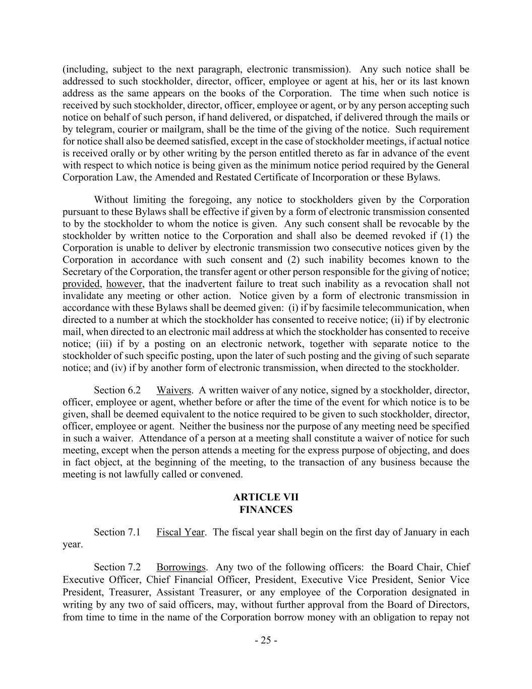 - 25 - (including, subject to the next paragraph, electronic transmission). Any such notice shall be addressed to such stockholder, director, officer, employee or agent at his, her or its last known address as the same appears on the books of the Corporation. The time when such notice is received by such stockholder, director, officer, employee or agent, or by any person accepting such notice on behalf of such person, if hand delivered, or dispatched, if delivered through the mails or by telegram, courier or mailgram, shall be the time of the giving of the notice. Such requirement for notice shall also be deemed satisfied, except in the case of stockholder meetings, if actual notice is received orally or by other writing by the person entitled thereto as far in advance of the event with respect to which notice is being given as the minimum notice period required by the General Corporation Law, the Amended and Restated Certificate of Incorporation or these Bylaws. Without limiting the foregoing, any notice to stockholders given by the Corporation pursuant to these Bylaws shall be effective if given by a form of electronic transmission consented to by the stockholder to whom the notice is given. Any such consent shall be revocable by the stockholder by written notice to the Corporation and shall also be deemed revoked if (1) the Corporation is unable to deliver by electronic transmission two consecutive notices given by the Corporation in accordance with such consent and (2) such inability becomes known to the Secretary of the Corporation, the transfer agent or other person responsible for the giving of notice; provided, however, that the inadvertent failure to treat such inability as a revocation shall not invalidate any meeting or other action. Notice given by a form of electronic transmission in accordance with these Bylaws shall be deemed given: (i) if by facsimile telecommunication, when directed to a number at which the stockholder has consented to receive notice; (ii) if by electronic mail, when directed to an electronic mail address at which the stockholder has consented to receive notice; (iii) if by a posting on an electronic network, together with separate notice to the stockholder of such specific posting, upon the later of such posting and the giving of such separate notice; and (iv) if by another form of electronic transmission, when directed to the stockholder. Section 6.2 Waivers. A written waiver of any notice, signed by a stockholder, director, officer, employee or agent, whether before or after the time of the event for which notice is to be given, shall be deemed equivalent to the notice required to be given to such stockholder, director, officer, employee or agent. Neither the business nor the purpose of any meeting need be specified in such a waiver. Attendance of a person at a meeting shall constitute a waiver of notice for such meeting, except when the person attends a meeting for the express purpose of objecting, and does in fact object, at the beginning of the meeting, to the transaction of any business because the meeting is not lawfully called or convened. ARTICLE VII FINANCES Section 7.1 Fiscal Year. The fiscal year shall begin on the first day of January in each year. Section 7.2 Borrowings. Any two of the following officers: the Board Chair, Chief Executive Officer, Chief Financial Officer, President, Executive Vice President, Senior Vice President, Treasurer, Assistant Treasurer, or any employee of the Corporation designated in writing by any two of said officers, may, without further approval from the Board of Directors, from time to time in the name of the Corporation borrow money with an obligation to repay not