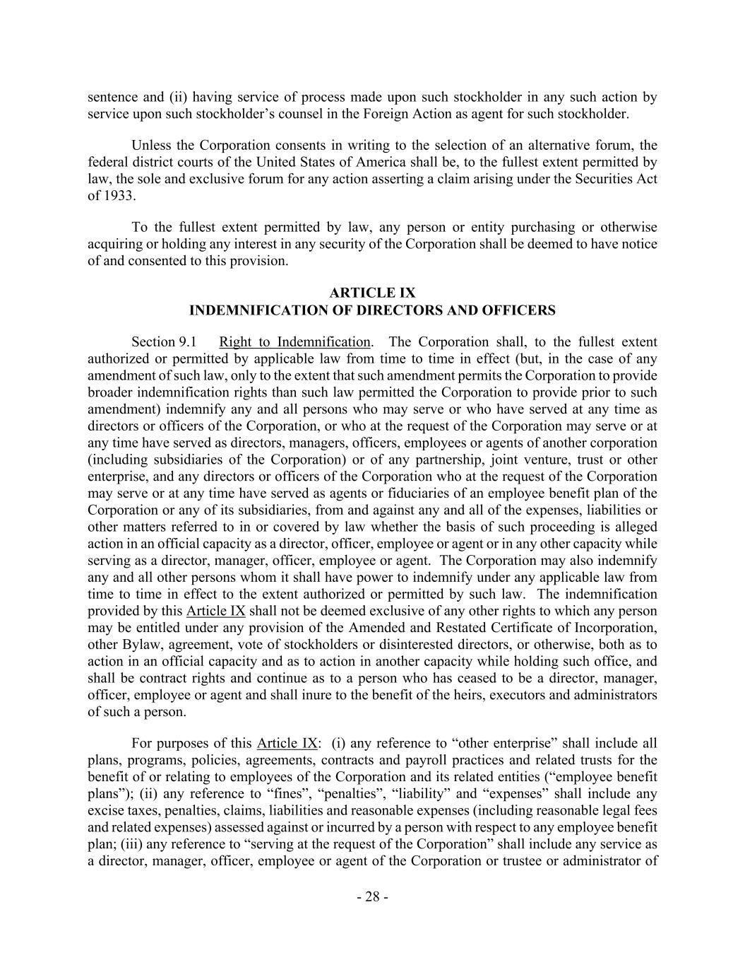 - 28 - sentence and (ii) having service of process made upon such stockholder in any such action by service upon such stockholder’s counsel in the Foreign Action as agent for such stockholder. Unless the Corporation consents in writing to the selection of an alternative forum, the federal district courts of the United States of America shall be, to the fullest extent permitted by law, the sole and exclusive forum for any action asserting a claim arising under the Securities Act of 1933. To the fullest extent permitted by law, any person or entity purchasing or otherwise acquiring or holding any interest in any security of the Corporation shall be deemed to have notice of and consented to this provision. ARTICLE IX INDEMNIFICATION OF DIRECTORS AND OFFICERS Section 9.1 Right to Indemnification. The Corporation shall, to the fullest extent authorized or permitted by applicable law from time to time in effect (but, in the case of any amendment of such law, only to the extent that such amendment permits the Corporation to provide broader indemnification rights than such law permitted the Corporation to provide prior to such amendment) indemnify any and all persons who may serve or who have served at any time as directors or officers of the Corporation, or who at the request of the Corporation may serve or at any time have served as directors, managers, officers, employees or agents of another corporation (including subsidiaries of the Corporation) or of any partnership, joint venture, trust or other enterprise, and any directors or officers of the Corporation who at the request of the Corporation may serve or at any time have served as agents or fiduciaries of an employee benefit plan of the Corporation or any of its subsidiaries, from and against any and all of the expenses, liabilities or other matters referred to in or covered by law whether the basis of such proceeding is alleged action in an official capacity as a director, officer, employee or agent or in any other capacity while serving as a director, manager, officer, employee or agent. The Corporation may also indemnify any and all other persons whom it shall have power to indemnify under any applicable law from time to time in effect to the extent authorized or permitted by such law. The indemnification provided by this Article IX shall not be deemed exclusive of any other rights to which any person may be entitled under any provision of the Amended and Restated Certificate of Incorporation, other Bylaw, agreement, vote of stockholders or disinterested directors, or otherwise, both as to action in an official capacity and as to action in another capacity while holding such office, and shall be contract rights and continue as to a person who has ceased to be a director, manager, officer, employee or agent and shall inure to the benefit of the heirs, executors and administrators of such a person. For purposes of this Article IX: (i) any reference to “other enterprise” shall include all plans, programs, policies, agreements, contracts and payroll practices and related trusts for the benefit of or relating to employees of the Corporation and its related entities (“employee benefit plans”); (ii) any reference to “fines”, “penalties”, “liability” and “expenses” shall include any excise taxes, penalties, claims, liabilities and reasonable expenses (including reasonable legal fees and related expenses) assessed against or incurred by a person with respect to any employee benefit plan; (iii) any reference to “serving at the request of the Corporation” shall include any service as a director, manager, officer, employee or agent of the Corporation or trustee or administrator of