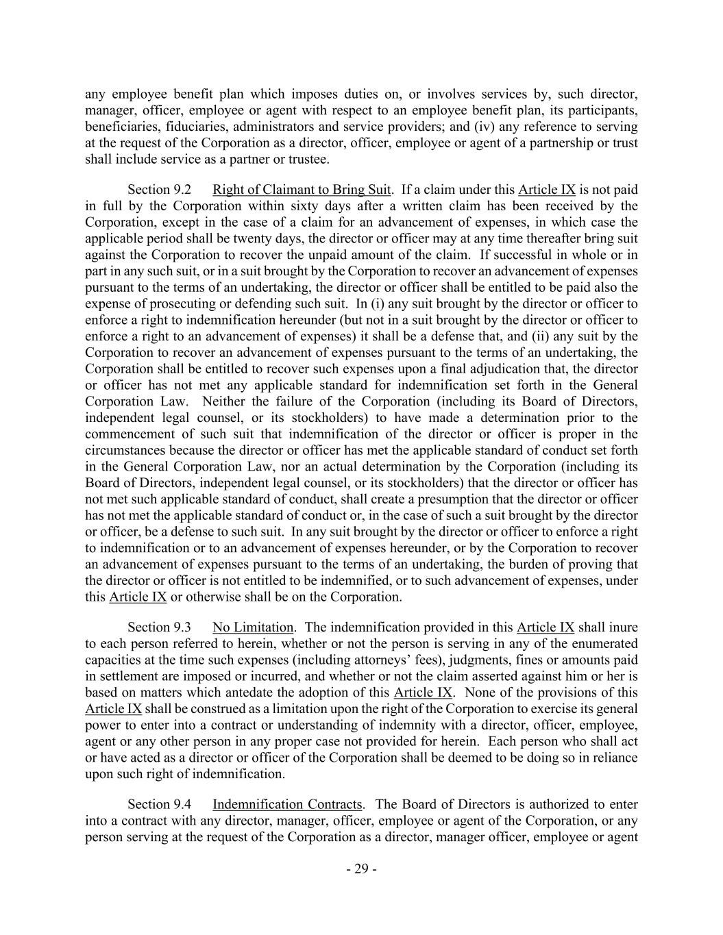 - 29 - any employee benefit plan which imposes duties on, or involves services by, such director, manager, officer, employee or agent with respect to an employee benefit plan, its participants, beneficiaries, fiduciaries, administrators and service providers; and (iv) any reference to serving at the request of the Corporation as a director, officer, employee or agent of a partnership or trust shall include service as a partner or trustee. Section 9.2 Right of Claimant to Bring Suit. If a claim under this Article IX is not paid in full by the Corporation within sixty days after a written claim has been received by the Corporation, except in the case of a claim for an advancement of expenses, in which case the applicable period shall be twenty days, the director or officer may at any time thereafter bring suit against the Corporation to recover the unpaid amount of the claim. If successful in whole or in part in any such suit, or in a suit brought by the Corporation to recover an advancement of expenses pursuant to the terms of an undertaking, the director or officer shall be entitled to be paid also the expense of prosecuting or defending such suit. In (i) any suit brought by the director or officer to enforce a right to indemnification hereunder (but not in a suit brought by the director or officer to enforce a right to an advancement of expenses) it shall be a defense that, and (ii) any suit by the Corporation to recover an advancement of expenses pursuant to the terms of an undertaking, the Corporation shall be entitled to recover such expenses upon a final adjudication that, the director or officer has not met any applicable standard for indemnification set forth in the General Corporation Law. Neither the failure of the Corporation (including its Board of Directors, independent legal counsel, or its stockholders) to have made a determination prior to the commencement of such suit that indemnification of the director or officer is proper in the circumstances because the director or officer has met the applicable standard of conduct set forth in the General Corporation Law, nor an actual determination by the Corporation (including its Board of Directors, independent legal counsel, or its stockholders) that the director or officer has not met such applicable standard of conduct, shall create a presumption that the director or officer has not met the applicable standard of conduct or, in the case of such a suit brought by the director or officer, be a defense to such suit. In any suit brought by the director or officer to enforce a right to indemnification or to an advancement of expenses hereunder, or by the Corporation to recover an advancement of expenses pursuant to the terms of an undertaking, the burden of proving that the director or officer is not entitled to be indemnified, or to such advancement of expenses, under this Article IX or otherwise shall be on the Corporation. Section 9.3 No Limitation. The indemnification provided in this Article IX shall inure to each person referred to herein, whether or not the person is serving in any of the enumerated capacities at the time such expenses (including attorneys’ fees), judgments, fines or amounts paid in settlement are imposed or incurred, and whether or not the claim asserted against him or her is based on matters which antedate the adoption of this Article IX. None of the provisions of this Article IX shall be construed as a limitation upon the right of the Corporation to exercise its general power to enter into a contract or understanding of indemnity with a director, officer, employee, agent or any other person in any proper case not provided for herein. Each person who shall act or have acted as a director or officer of the Corporation shall be deemed to be doing so in reliance upon such right of indemnification. Section 9.4 Indemnification Contracts. The Board of Directors is authorized to enter into a contract with any director, manager, officer, employee or agent of the Corporation, or any person serving at the request of the Corporation as a director, manager officer, employee or agent