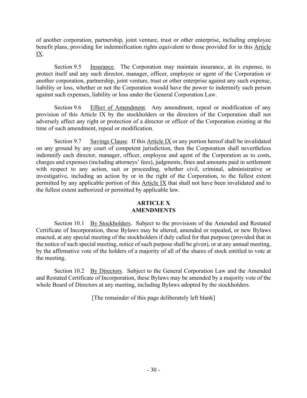 - 30 - of another corporation, partnership, joint venture, trust or other enterprise, including employee benefit plans, providing for indemnification rights equivalent to those provided for in this Article IX. Section 9.5 Insurance. The Corporation may maintain insurance, at its expense, to protect itself and any such director, manager, officer, employee or agent of the Corporation or another corporation, partnership, joint venture, trust or other enterprise against any such expense, liability or loss, whether or not the Corporation would have the power to indemnify such person against such expenses, liability or loss under the General Corporation Law. Section 9.6 Effect of Amendment. Any amendment, repeal or modification of any provision of this Article IX by the stockholders or the directors of the Corporation shall not adversely affect any right or protection of a director or officer of the Corporation existing at the time of such amendment, repeal or modification. Section 9.7 Savings Clause. If this Article IX or any portion hereof shall be invalidated on any ground by any court of competent jurisdiction, then the Corporation shall nevertheless indemnify each director, manager, officer, employee and agent of the Corporation as to costs, charges and expenses (including attorneys’ fees), judgments, fines and amounts paid in settlement with respect to any action, suit or proceeding, whether civil, criminal, administrative or investigative, including an action by or in the right of the Corporation, to the fullest extent permitted by any applicable portion of this Article IX that shall not have been invalidated and to the fullest extent authorized or permitted by applicable law. ARTICLE X AMENDMENTS Section 10.1 By Stockholders. Subject to the provisions of the Amended and Restated Certificate of Incorporation, these Bylaws may be altered, amended or repealed, or new Bylaws enacted, at any special meeting of the stockholders if duly called for that purpose (provided that in the notice of such special meeting, notice of such purpose shall be given), or at any annual meeting, by the affirmative vote of the holders of a majority of all of the shares of stock entitled to vote at the meeting. Section 10.2 By Directors. Subject to the General Corporation Law and the Amended and Restated Certificate of Incorporation, these Bylaws may be amended by a majority vote of the whole Board of Directors at any meeting, including Bylaws adopted by the stockholders. [The remainder of this page deliberately left blank]