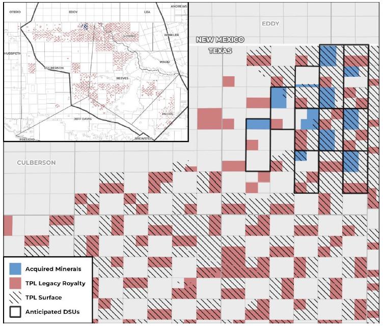 TPL acquired mineral interests across approximately 4,106 net royalty acres located in Culberson County, Texas. The acquired mineral interests overlap existing TPL royalty acreage in current and anticipated Drilling and Spacing Units (“DSU”), enhancing TPL’s net revenue interests in existing and future oil and gas wells. The acreage is leased to and operated by Coterra Energy (NYSE: CTRA). In addition, the acquired mineral interests overlap with TPL surface acreage.