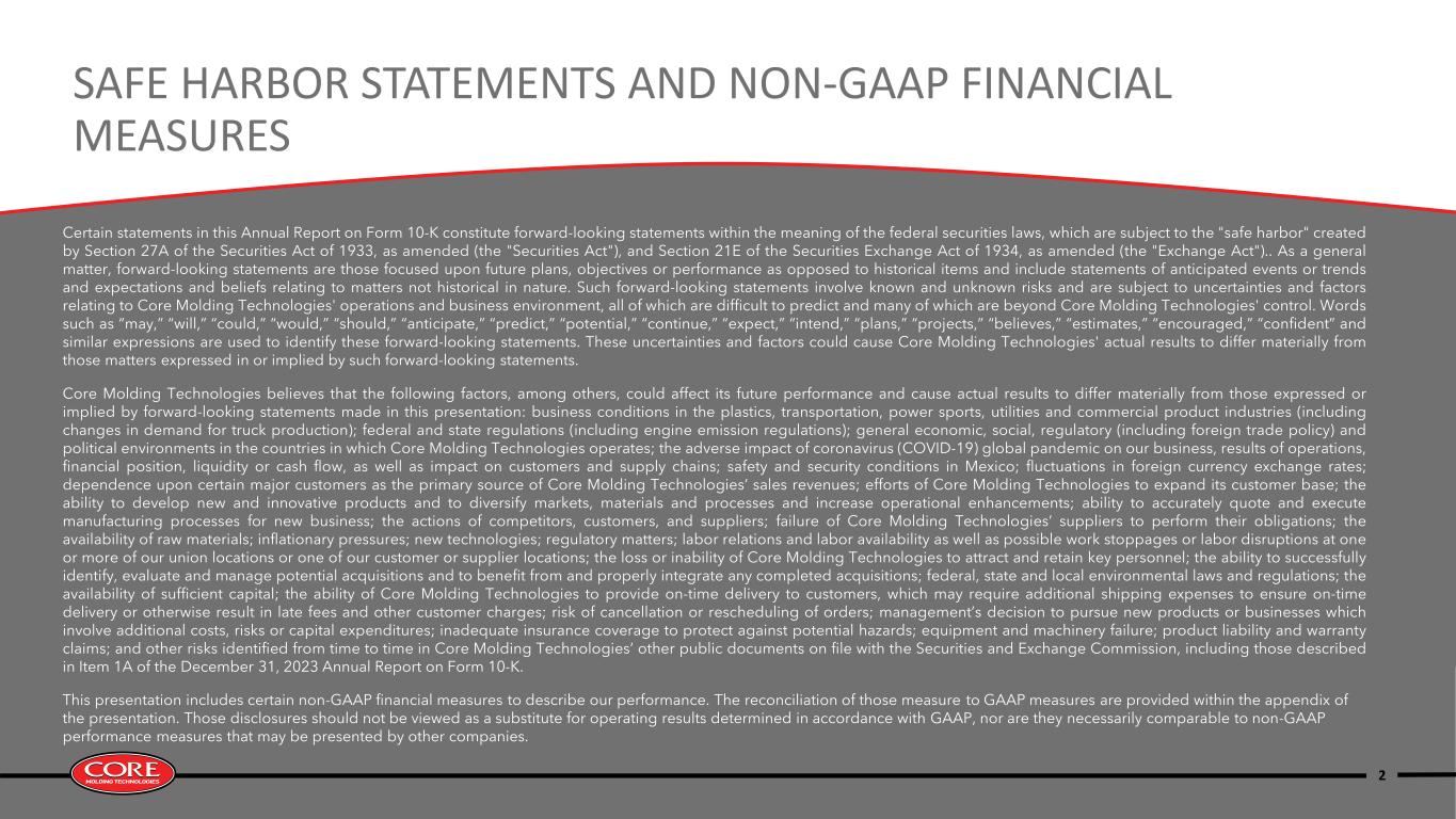 SAFE HARBOR STATEMENTS AND NON-GAAP FINANCIAL MEASURES 2 Certain statements in this Annual Report on Form 10-K constitute forward-looking statements within the meaning of the federal securities laws, which are subject to the "safe harbor" created by Section 27A of the Securities Act of 1933, as amended (the "Securities Act"), and Section 21E of the Securities Exchange Act of 1934, as amended (the "Exchange Act").. As a general matter, forward-looking statements are those focused upon future plans, objectives or performance as opposed to historical items and include statements of anticipated events or trends and expectations and beliefs relating to matters not historical in nature. Such forward-looking statements involve known and unknown risks and are subject to uncertainties and factors relating to Core Molding Technologies' operations and business environment, all of which are difficult to predict and many of which are beyond Core Molding Technologies' control. Words such as “may,” “will,” “could,” “would,” “should,” “anticipate,” “predict,” “potential,” “continue,” “expect,” “intend,” “plans,” “projects,” “believes,” “estimates,” “encouraged,” “confident” and similar expressions are used to identify these forward-looking statements. These uncertainties and factors could cause Core Molding Technologies' actual results to differ materially from those matters expressed in or implied by such forward-looking statements. Core Molding Technologies believes that the following factors, among others, could affect its future performance and cause actual results to differ materially from those expressed or implied by forward-looking statements made in this presentation: business conditions in the plastics, transportation, power sports, utilities and commercial product industries (including changes in demand for truck production); federal and state regulations (including engine emission regulations); general economic, social, regulatory (including foreign trade policy) and political environments in the countries in which Core Molding Technologies operates; the adverse impact of coronavirus (COVID-19) global pandemic on our business, results of operations, financial position, liquidity or cash flow, as well as impact on customers and supply chains; safety and security conditions in Mexico; fluctuations in foreign currency exchange rates; dependence upon certain major customers as the primary source of Core Molding Technologies’ sales revenues; efforts of Core Molding Technologies to expand its customer base; the ability to develop new and innovative products and to diversify markets, materials and processes and increase operational enhancements; ability to accurately quote and execute manufacturing processes for new business; the actions of competitors, customers, and suppliers; failure of Core Molding Technologies’ suppliers to perform their obligations; the availability of raw materials; inflationary pressures; new technologies; regulatory matters; labor relations and labor availability as well as possible work stoppages or labor disruptions at one or more of our union locations or one of our customer or supplier locations; the loss or inability of Core Molding Technologies to attract and retain key personnel; the ability to successfully identify, evaluate and manage potential acquisitions and to benefit from and properly integrate any completed acquisitions; federal, state and local environmental laws and regulations; the availability of sufficient capital; the ability of Core Molding Technologies to provide on-time delivery to customers, which may require additional shipping expenses to ensure on-time delivery or otherwise result in late fees and other customer charges; risk of cancellation or rescheduling of orders; management’s decision to pursue new products or businesses which involve additional costs, risks or capital expenditures; inadequate insurance coverage to protect against potential hazards; equipment and machinery failure; product liability and warranty claims; and other risks identified from time to time in Core Molding Technologies’ other public documents on file with the Securities and Exchange Commission, including those described in Item 1A of the December 31, 2023 Annual Report on Form 10-K. This presentation includes certain non-GAAP financial measures to describe our performance. The reconciliation of those measure to GAAP measures are provided within the appendix of the presentation. Those disclosures should not be viewed as a substitute for operating results determined in accordance with GAAP, nor are they necessarily comparable to non-GAAP performance measures that may be presented by other companies.