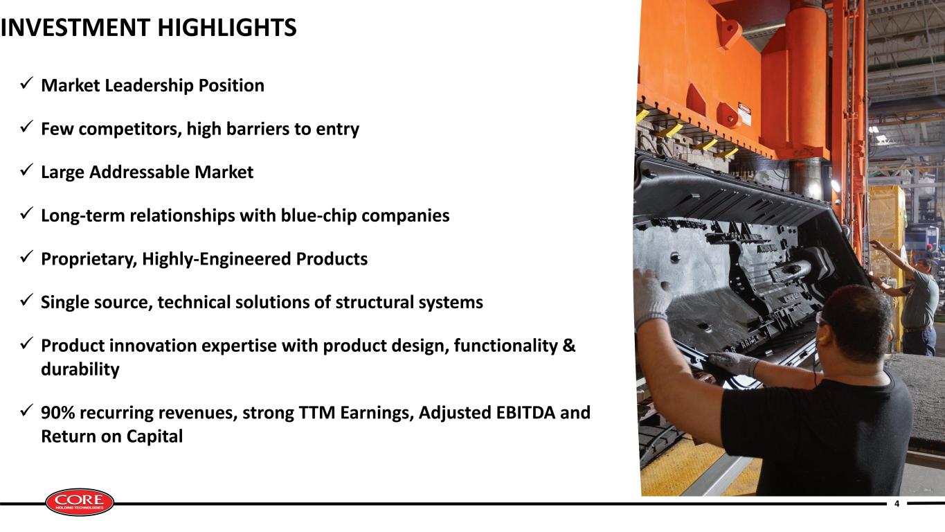 US 44% Canada 16% Mexico 40% CORE MOLDING TECHNOLOGIES The most reliable, innovative and responsive partner in engineered materials and manufacturing solutions: SOLUTION | INNOVATION | MANUFACTURING Diversified Portfolio with Long Term Customer Relationships Building Products Industrial & Utilities Power Sports Transportation (1) Based on 2023 sales by Core production location. 2023 Sales By Country $358M(1) Headquartered in Columbus, OH Employees 1,857 NYSE American CMT Founded in 1980 Adjusted EBITDA 12 Months Ended December 31, 2023 = $42.3M (2) 3 (2) Adjusted EBITDA is a non-GAAP financial measure as defined and reconciled later in this presentation.
