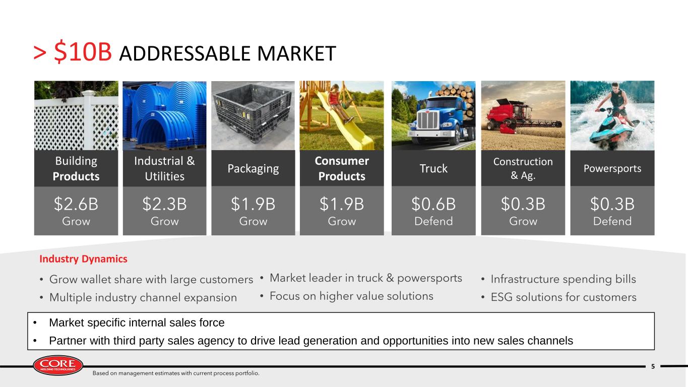 ✓ Market Leadership Position ✓ Few competitors, high barriers to entry ✓ Large Addressable Market ✓ Long-term relationships with blue-chip companies ✓ Proprietary, Highly-Engineered Products ✓ Single source, technical solutions of structural systems ✓ Product innovation expertise with product design, functionality & durability ✓ 90% recurring revenues, strong TTM Earnings, Adjusted EBITDA and Return on Capital INVESTMENT HIGHLIGHTS 4