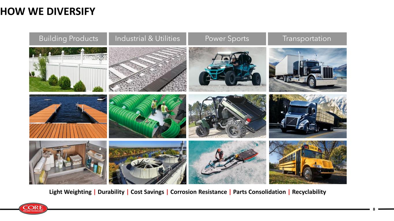 HOW WE DIVERSIFY 8 Building Products Industrial & Utilities Power Sports Transportation Light Weighting | Durability | Cost Savings | Corrosion Resistance | Parts Consolidation | Recyclability
