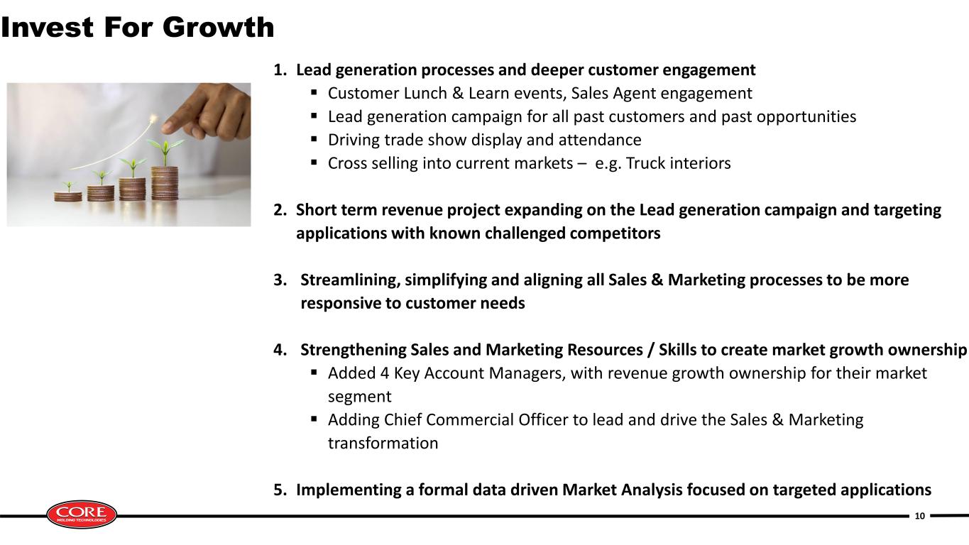 Invest For Growth 1. Lead generation processes and deeper customer engagement ▪ Customer Lunch & Learn events, Sales Agent engagement ▪ Lead generation campaign for all past customers and past opportunities ▪ Driving trade show display and attendance ▪ Cross selling into current markets – e.g. Truck interiors 2. Short term revenue project expanding on the Lead generation campaign and targeting applications with known challenged competitors 3. Streamlining, simplifying and aligning all Sales & Marketing processes to be more responsive to customer needs 4. Strengthening Sales and Marketing Resources / Skills to create market growth ownership ▪ Added 4 Key Account Managers, with revenue growth ownership for their market segment ▪ Adding Chief Commercial Officer to lead and drive the Sales & Marketing transformation 5. Implementing a formal data driven Market Analysis focused on targeted applications 10