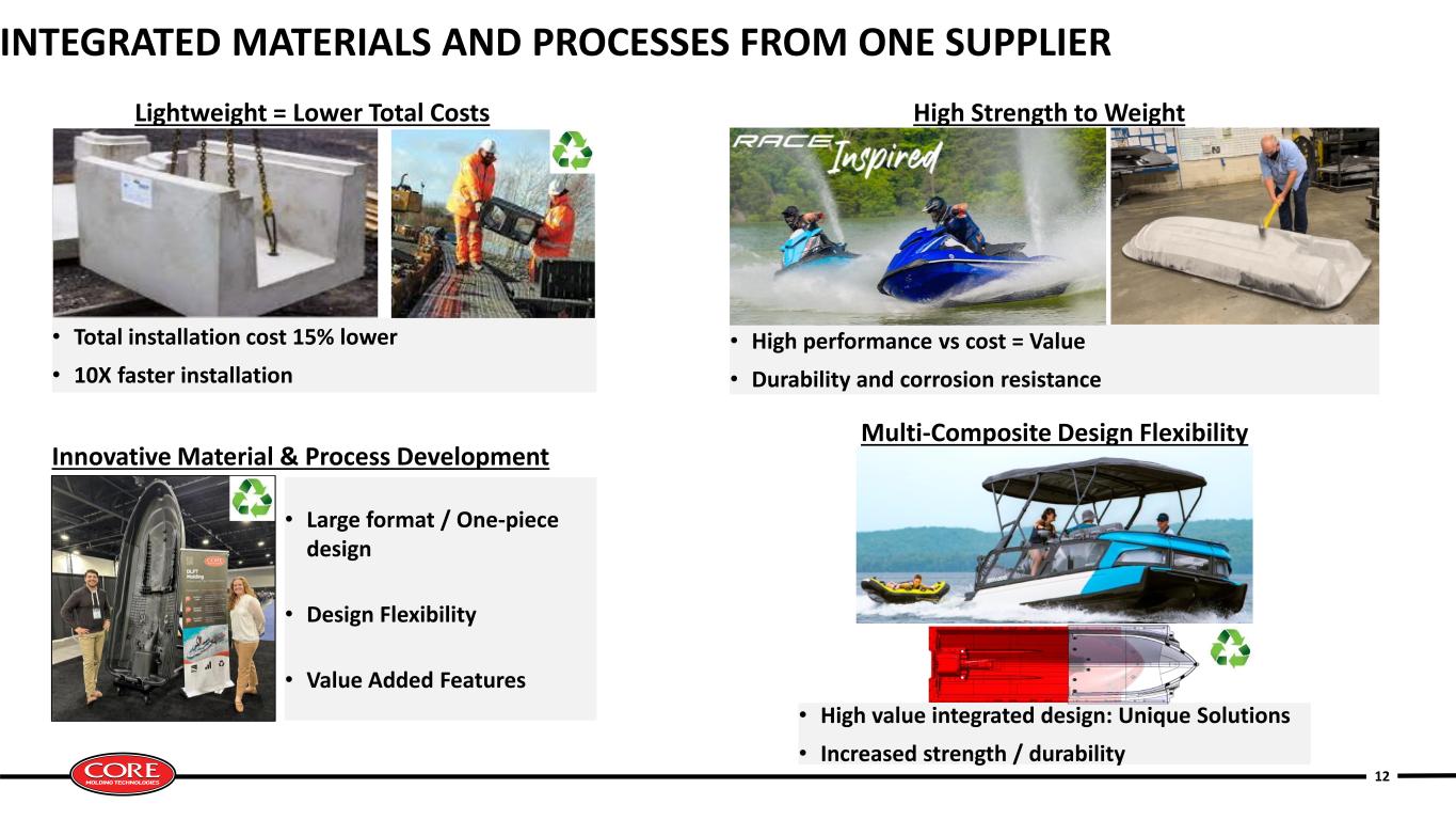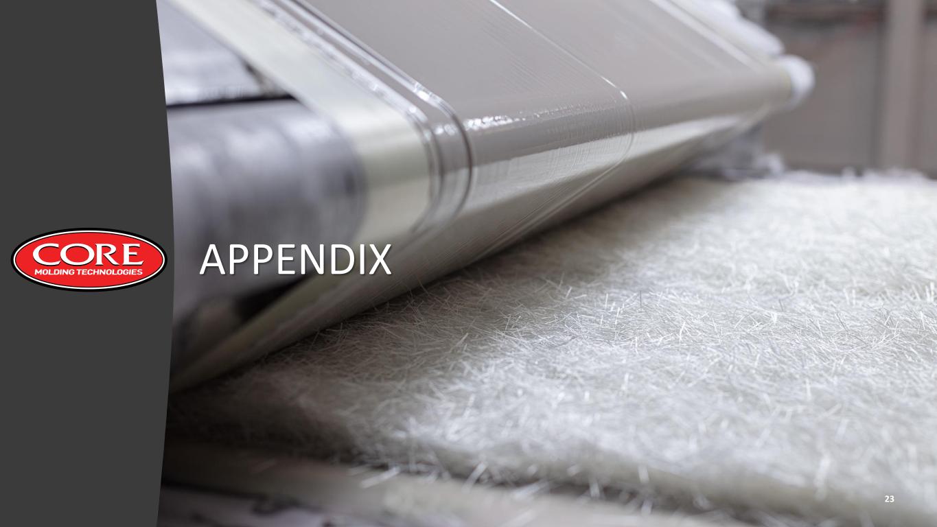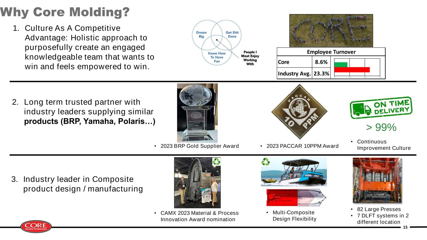 Why Core Molding? 1. Culture As A Competitive Advantage: Holistic approach to purposefully create an engaged knowledgeable team that wants to win and feels empowered to win. 3. Industry leader in Composite product design / manufacturing 2. Long term trusted partner with industry leaders supplying similar products (BRP, Yamaha, Polaris…) • CAMX 2023 Material & Process Innovation Award nomination • Multi-Composite Design Flexibility • 2023 BRP Gold Supplier Award • 2023 PACCAR 10PPM Award • 82 Large Presses • 7 DLFT systems in 2 different location > 99% • Continuous Improvement Culture Core 8.6% Industry Avg. 23.3% Employee Turnover 0.0% 10.0% 20.0% 30.0% 1 15