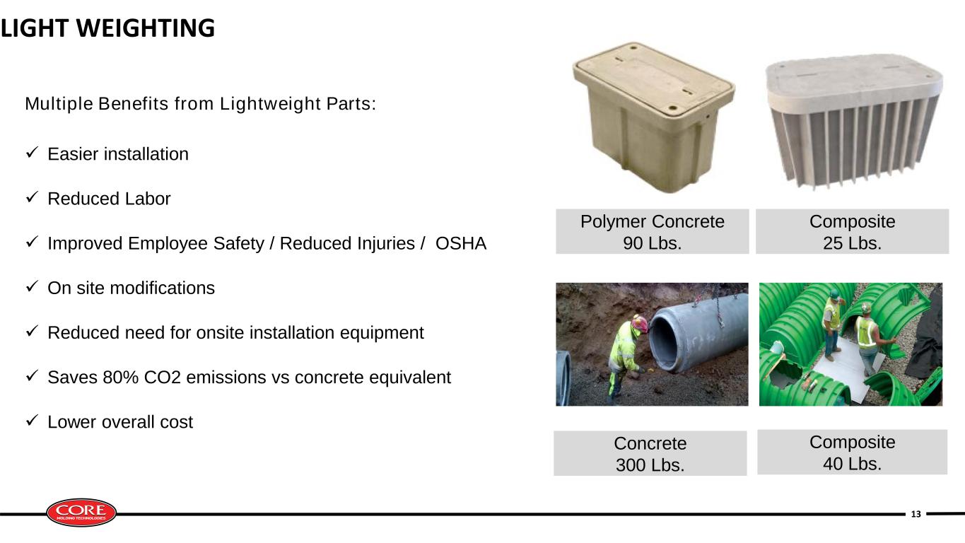 INTEGRATED MATERIALS AND PROCESSES FROM ONE SUPPLIER 12 High Strength to Weight • High performance vs cost = Value • Durability and corrosion resistance Innovative Material & Process Development • Large format / One-piece design • Design Flexibility • Value Added Features Lightweight = Lower Total Costs • Total installation cost 15% lower • 10X faster installation Multi-Composite Design Flexibility • High value integrated design: Unique Solutions • Increased strength / durability