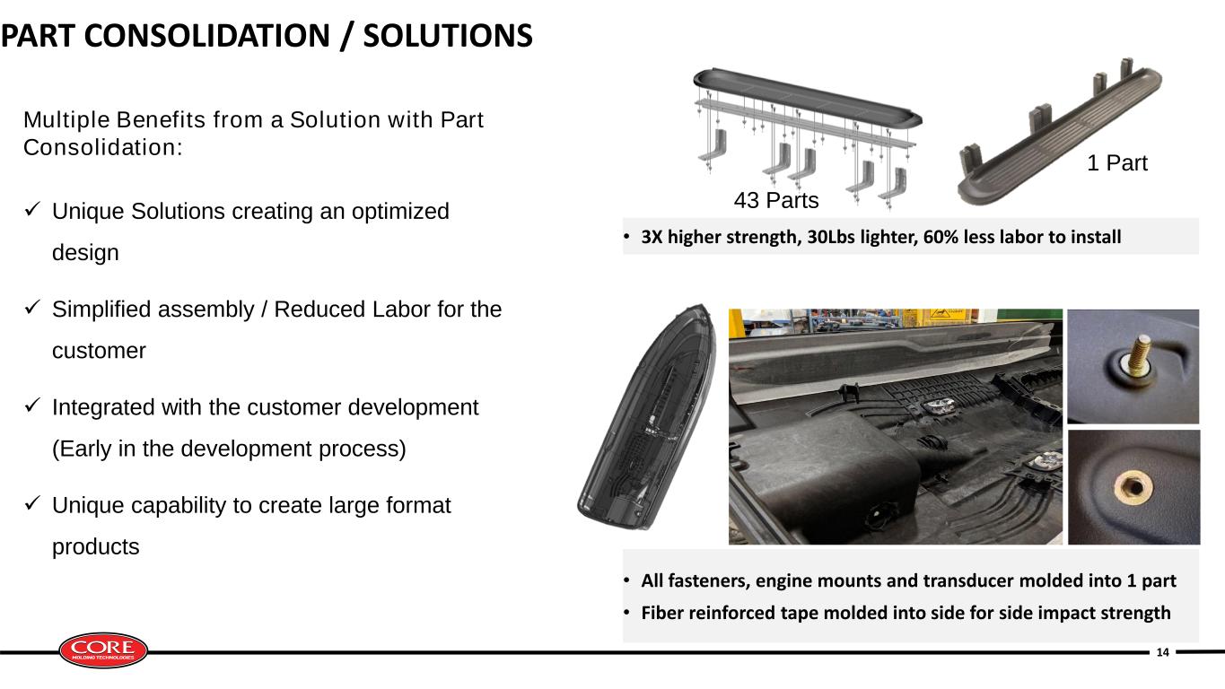 PART CONSOLIDATION / SOLUTIONS 14 Multiple Benefits from a Solution with Part Consolidation: ✓ Unique Solutions creating an optimized design ✓ Simplified assembly / Reduced Labor for the customer ✓ Integrated with the customer development (Early in the development process) ✓ Unique capability to create large format products • 3X higher strength, 30Lbs lighter, 60% less labor to install 43 Parts 1 Part • All fasteners, engine mounts and transducer molded into 1 part • Fiber reinforced tape molded into side for side impact strength