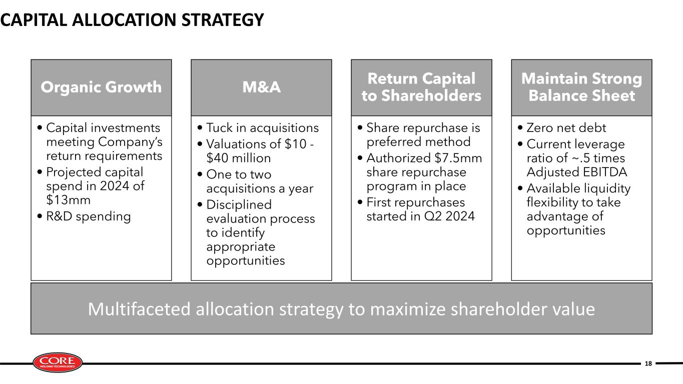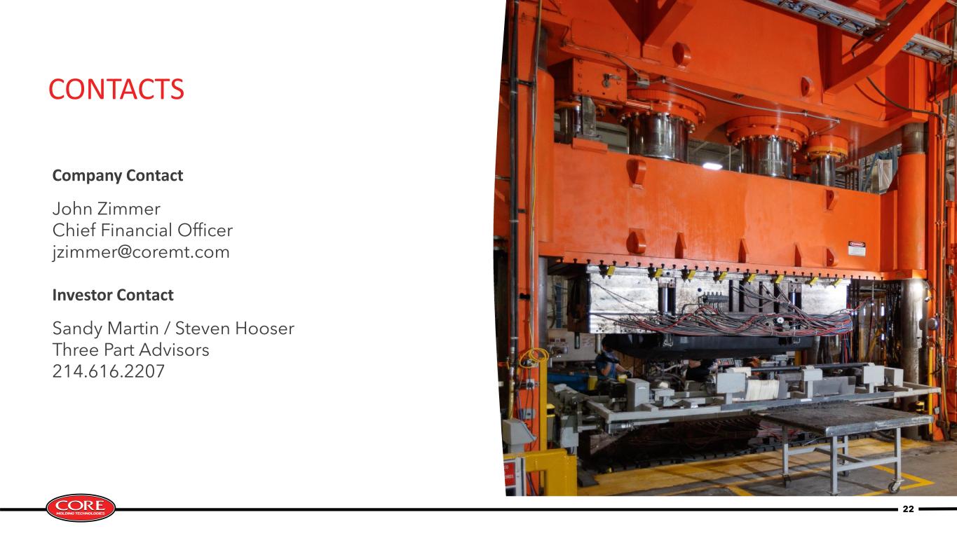 CONTACTS 22 Company Contact John Zimmer Chief Financial Officer jzimmer@coremt.com Investor Contact Sandy Martin / Steven Hooser Three Part Advisors 214.616.2207