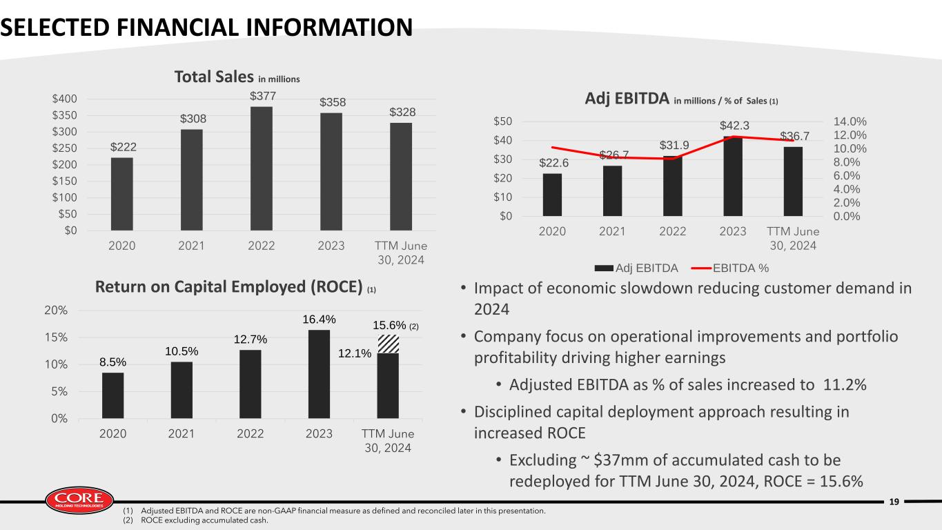 SELECTED FINANCIAL INFORMATION 19 • Impact of economic slowdown reducing customer demand in 2024 • Company focus on operational improvements and portfolio profitability driving higher earnings • Adjusted EBITDA as % of sales increased to 11.2% • Disciplined capital deployment approach resulting in increased ROCE • Excluding ~ $37mm of accumulated cash to be redeployed for TTM June 30, 2024, ROCE = 15.6% $222 $308 $377 $358 $328 $0 $50 $100 $150 $200 $250 $300 $350 $400 2020 2021 2022 2023 TTM June 30, 2024 Total Sales in millions $22.6 $26.7 $31.9 $42.3 $36.7 0.0% 2.0% 4.0% 6.0% 8.0% 10.0% 12.0% 14.0% $0 $10 $20 $30 $40 $50 2020 2021 2022 2023 TTM June 30, 2024 Adj EBITDA in millions / % of Sales (1) Adj EBITDA EBITDA % 8.5% 10.5% 12.7% 16.4% 12.1% 0% 5% 10% 15% 20% 2020 2021 2022 2023 TTM June 30, 2024 Return on Capital Employed (ROCE) (1) 15.6% (2) (1) Adjusted EBITDA and ROCE are non-GAAP financial measure as defined and reconciled later in this presentation. (2) ROCE excluding accumulated cash.