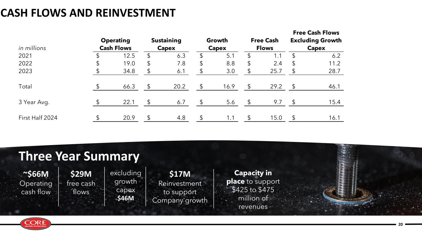 in millions Operating Cash Flows Sustaining Capex Growth Capex Free Cash Flows Free Cash Flows Excluding Growth Capex 2021 12.5$ 6.3$ 5.1$ 1.1$ 6.2$ 2022 19.0$ 7.8$ 8.8$ 2.4$ 11.2$ 2023 34.8$ 6.1$ 3.0$ 25.7$ 28.7$ Total 66.3$ 20.2$ 16.9$ 29.2$ 46.1$ 3 Year Avg. 22.1$ 6.7$ 5.6$ 9.7$ 15.4$ First Half 2024 20.9$ 4.8$ 1.1$ 15.0$ 16.1$ CASH FLOWS AND REINVESTMENT 20 Three Year Summary ~$66M Operating cash flow $29M free cash flows $17M Reinvestment to support Company growth excluding growth capex $46M Capacity in place to support $425 to $475 million of revenues