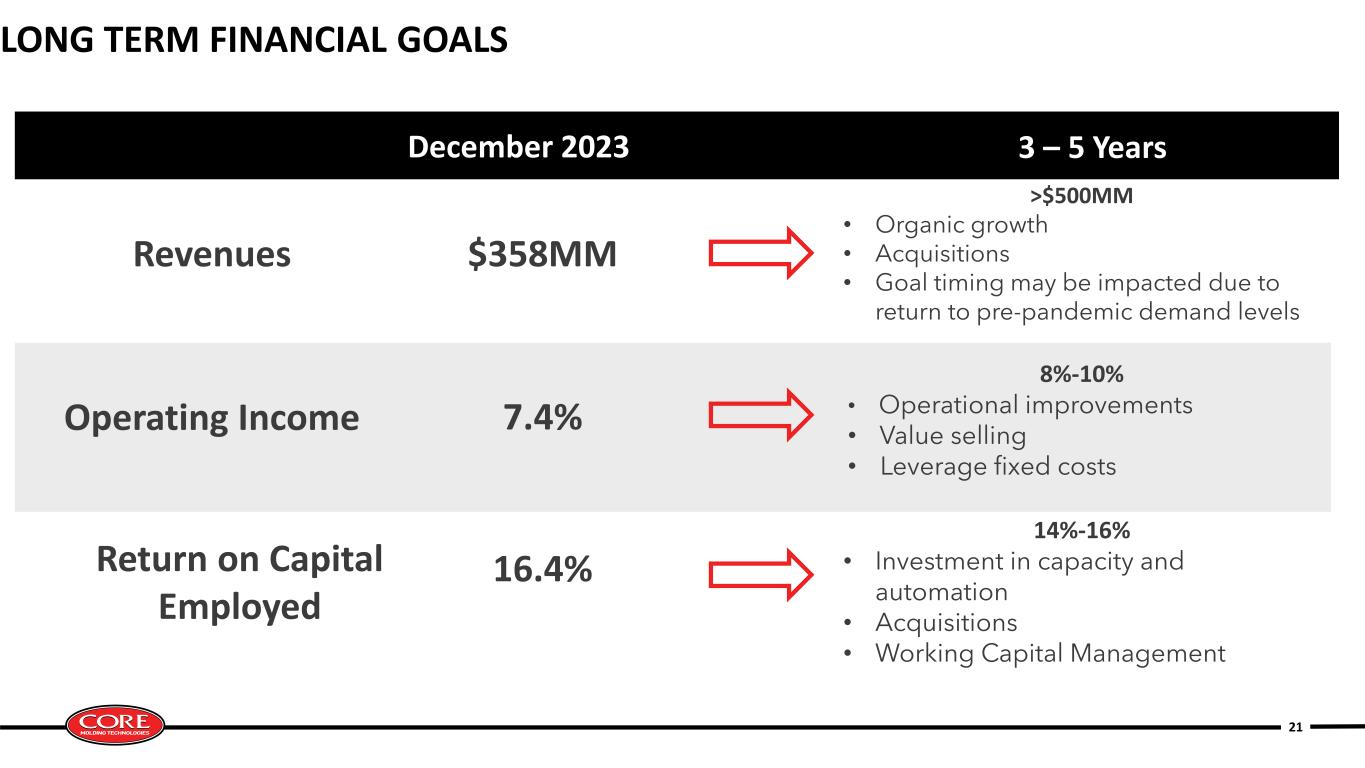 LONG TERM FINANCIAL GOALS Revenues Operating Income Return on Capital Employed December 2023 3 – 5 Years $358MM 7.4% 16.4% >$500MM • Organic growth • Acquisitions • Goal timing may be impacted due to return to pre-pandemic demand levels 8%-10% • Operational improvements • Value selling • Leverage fixed costs 14%-16% • Investment in capacity and automation • Acquisitions • Working Capital Management 21
