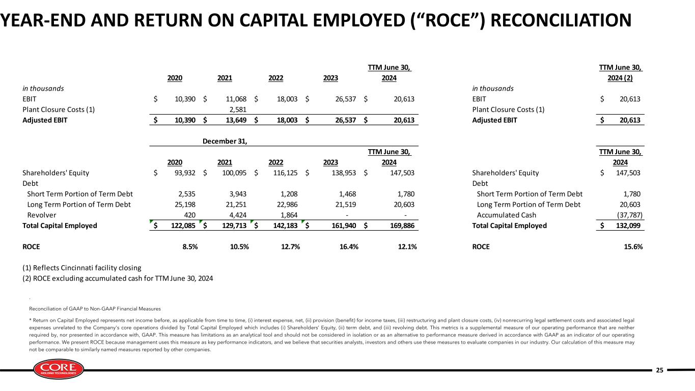 NET INCOME (LOSS) TO ADJUSTED EBITDA RECONCILIATION (1) Includes net interest expense, non-cash periodic post retirement costs and loss on extinguishment of debt. (2) Reflects Cincinnati facility closing. Reconciliation of GAAP to Non-GAAP Financial Measures * Adjusted EBITDA represents net income before, as applicable from time to time, (i) interest expense, net, (ii) provision (benefit) for income taxes, (iii) depreciation and amortization of long-lived assets, (iv) share based compensation expense, (v) non-reoccurring charges including restructuring costs, plant closure costs, goodwill impairment charges, (vi) nonrecurring legal settlement costs and associated legal expenses unrelated to the Company's core operations. This metrics is a supplemental measures of our operating performance that are neither required by, nor presented in accordance with, GAAP. This measure has limitations as an analytical tool and should not be considered in isolation or as an alternative to performance measure derived in accordance with GAAP as an indicator of our operating performance. We present Adjusted EBITDA because management uses this measure as key performance indicators, and we believe that securities analysts, investors and others use this measure to evaluate companies in our industry. Our calculation of this measure may not be comparable to similarly named measures reported by other companies. The above table presents a reconciliation of net income (loss), the most directly comparable measure calculated in accordance with GAAP, to Adjusted EBITDA for the periods presented. 24 In thousands 2015 2016 2017 2018 2019 2020 2021 2022 2023 TTM June 30 2024 Net income (loss) 12,050$ 7,411$ 5,459$ (4,782)$ (15,223)$ 8,165$ 4,671$ 12,203$ 20,324$ 16,714$ Income tax expense (benefit) 6,118$ 3,836$ 2,286$ (664)$ (355)$ (3,618)$ 4,248$ 2,382$ 5,422$ 3,884$ Other expenses (1) 330$ 298$ 245$ 2,394$ 4,144$ 5,923$ 2,149$ 3,418$ 791$ 15$ Depreciation and amortization 6,041$ 6,283$ 6,240$ 9,384$ 10,376$ 10,775$ 11,130$ 11,603$ 12,831$ 13,103$ Share-based compensation 785$ 1,003$ 1,331$ 1,743$ 1,564$ 1,355$ 1,886$ 2,329$ 2,923$ 2,941$ Goodwill impairment -$ -$ -$ 2,403$ 4,100$ -$ -$ -$ -$ -$ Plant closure costs(2) -$ -$ -$ -$ -$ -$ 2,581$ -$ -$ -$ Adjusted EBITDA* 25,324$ 18,831$ 15,561$ 10,478$ 4,606$ 22,600$ 26,665$ 31,935$ 42,291$ 36,657$ Twelve Months Ended December 31,