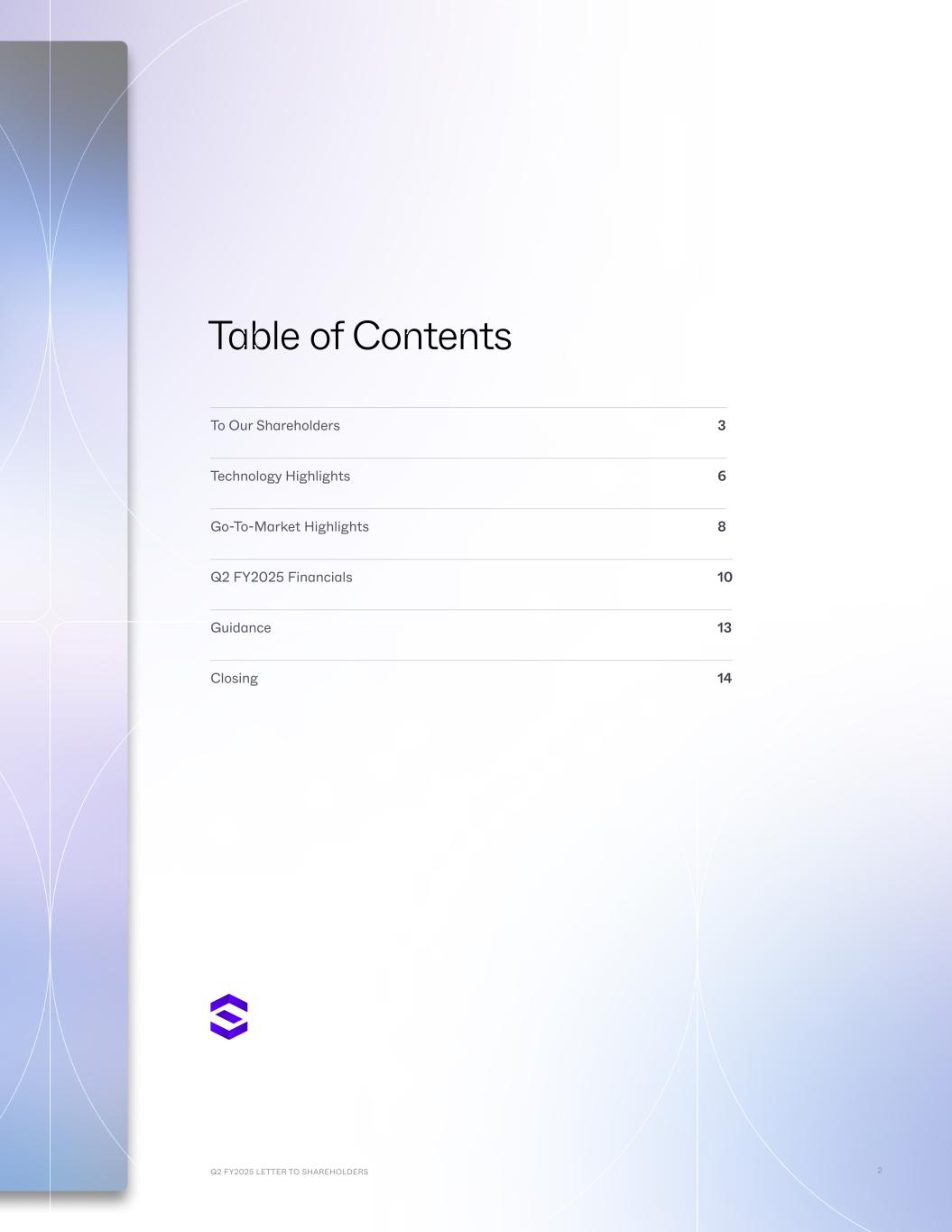 Q2 FY2025 Letter to SharehoLderS 2 Table of Contents to our Shareholders 3 technology highlights 6 Go-to-Market highlights 8 Q2 FY2025 Financials 10 Guidance 13 Closing 14