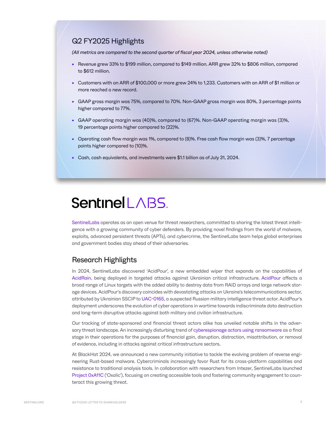 Q2 FY2025 Letter to SharehoLderSSENTINELONE 5 Q2 FY2025 Highlights (All metrics are compared to the second quarter of fiscal year 2024, unless otherwise noted) • revenue grew 33% to $199 million, compared to $149 million. arr grew 32% to $806 million, compared to $612 million. • Customers with an arr of $100,000 or more grew 24% to 1,233. Customers with an arr of $1 million or more reached a new record. • GaaP gross margin was 75%, compared to 70%. Non-GaaP gross margin was 80%, 3 percentage points higher compared to 77%. • GaaP operating margin was (40)%, compared to (67)%. Non-GaaP operating margin was (3)%, 19 percentage points higher compared to (22)%. • Operating cash flow margin was 1%, compared to (8)%. Free cash flow margin was (3)%, 7 percentage points higher compared to (10)%. • Cash, cash equivalents, and investments were $1.1 billion as of July 31, 2024. SentinelLabs operates as an open venue for threat researchers, committed to sharing the latest threat intelli- gence with a growing community of cyber defenders. By providing novel findings from the world of malware, exploits, advanced persistent threats (APTs), and cybercrime, the SentinelLabs team helps global enterprises and government bodies stay ahead of their adversaries. Research Highlights In 2024, SentinelLabs discovered ‘AcidPour’, a new embedded wiper that expands on the capabilities of AcidRain, being deployed in targeted attacks against Ukrainian critical infrastructure. AcidPour affects a broad range of Linux targets with the added ability to destroy data from RAID arrays and large network stor- age devices. AcidPour's discovery coincides with devastating attacks on Ukraine's telecommunications sector, attributed by Ukrainian SSCIP to UAC-0165, a suspected Russian military intelligence threat actor. AcidPour's deployment underscores the evolution of cyber operations in wartime towards indiscriminate data destruction and long-term disruptive attacks against both military and civilian infrastructure. Our tracking of state-sponsored and financial threat actors alike has unveiled notable shifts in the adver- sary threat landscape. An increasingly disturbing trend of cyberespionage actors using ransomware as a final stage in their operations for the purposes of financial gain, disruption, distraction, misattribution, or removal of evidence, including in attacks against critical infrastructure sectors. At BlackHat 2024, we announced a new community initiative to tackle the evolving problem of reverse engi- neering Rust-based malware. Cybercriminals increasingly favor Rust for its cross-platform capabilities and resistance to traditional analysis tools. In collaboration with researchers from Intezer, SentinelLabs launched Project 0xA11C (‘Oxalic’), focusing on creating accessible tools and fostering community engagement to coun- teract this growing threat.