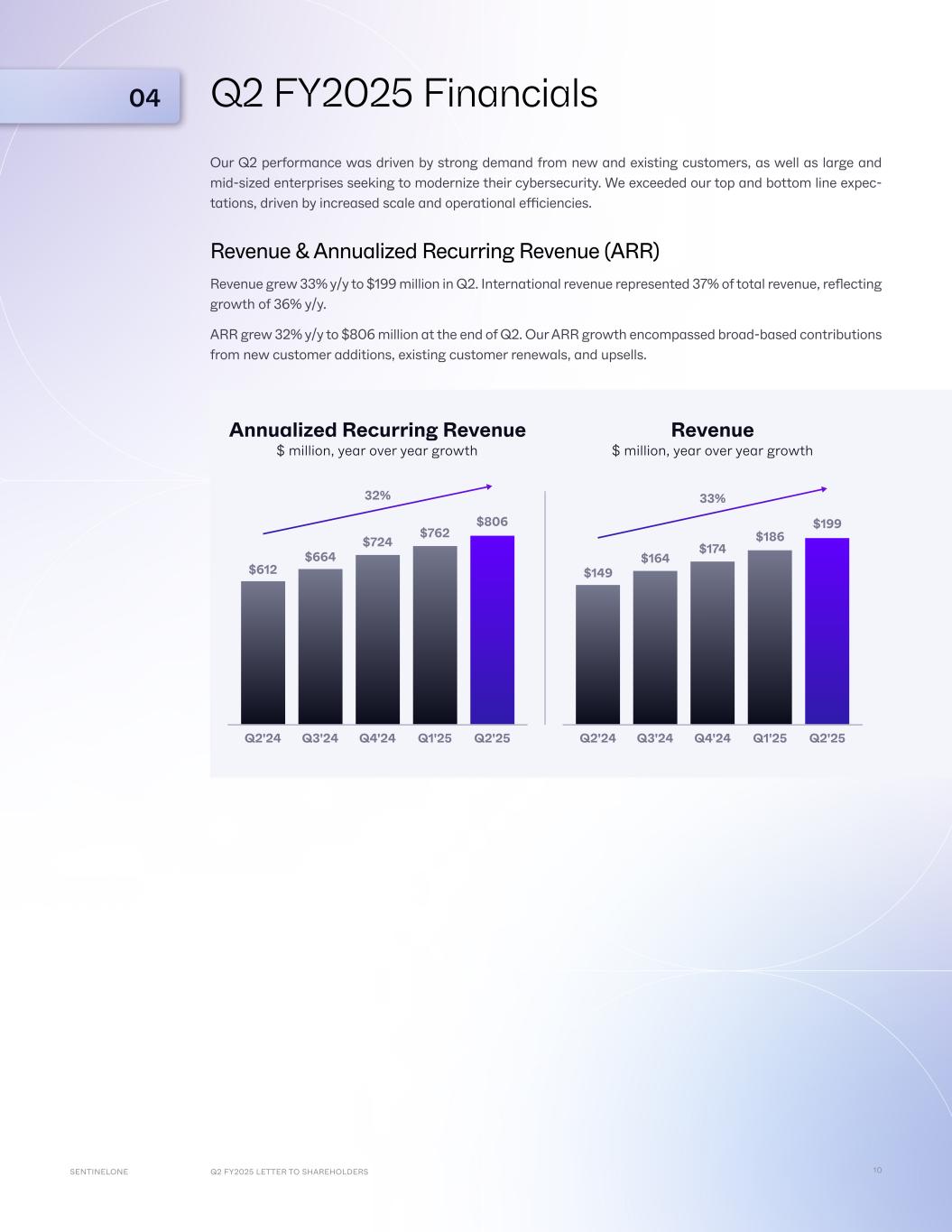 Q2 FY2025 Letter to SharehoLderSSENTINELONE 10 04 Q2 FY2025 Financials Our Q2 performance was driven by strong demand from new and existing customers, as well as large and mid-sized enterprises seeking to modernize their cybersecurity. We exceeded our top and bottom line expec- tations, driven by increased scale and operational efficiencies. Revenue & Annualized Recurring Revenue (ARR) Revenue grew 33% y/y to $199 million in Q2. International revenue represented 37% of total revenue, reflecting growth of 36% y/y. ARR grew 32% y/y to $806 million at the end of Q2. Our ARR growth encompassed broad-based contributions from new customer additions, existing customer renewals, and upsells. Q3'24Q2'24 Q4'24 Q1'25 Q2'25Q3'24Q2'24 Q4'24 Q1'25 Q2'25 Annualized Recurring Revenue $ million, year over year growth Revenue $ million, year over year growth $149 33% $164 $174 $186 $199 32% $612 $664 $724 $762 $806
