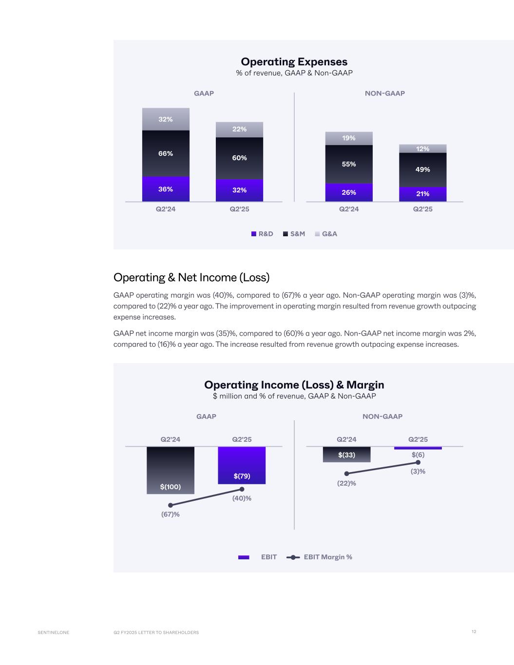 Q2 FY2025 Letter to SharehoLderSSENTINELONE 11 Gross Profit & Margin Gross profit was $148 million, or 75% of revenue, compared to 70% of revenue a year ago. Non-GAAP gross profit was $158 million, or 80% of revenue, compared to 77% of revenue a year ago. This y/y increase was driv- en primarily by increasing scale, data efficiencies, and customers’ growing platform adoption. GAAP Non-GAAP Q2'24 Q3'24 Q4'24 Q1'25 Q2'25 Gross Margin % of revenue, GAAP & Non-GAAP 77% 79% 78% 79% 70% 73% 72% 73% 80% 75% Operating Expenses Total operating expenses were $228 million, including $63 million of stock-based compensation (SBC) ex- pense, employer payroll tax on employee stock transactions, amortization of acquired intangible assets, and acquisition-related compensation costs. Total operating expenses increased 11% y/y, primarily due to an in- crease in headcount and stock-based compensation. Non-GAAP operating expenses were $165 million, rep- resenting 83% of revenue, compared to $148 million, or 99% of revenue, a year ago. Non-GAAP operating expenses grew 11% y/y, driven by an increase in headcount. Research and development expenses were $64 million, up 17% y/y. On a non-GAAP basis, research and devel- opment expenses increased 9% y/y to $42 million and represented 21% of revenue, compared to 26% a year ago. The y/y increase was primarily due to higher headcount. Sales and marketing expenses were $120 million, up 22% y/y. On a non-GAAP basis, sales and marketing expenses increased 19% y/y to $98 million and represented 49% of revenue, compared to 55% a year ago. The y/y increase was primarily due to a higher headcount. General and administrative expenses were $44 million, down 8% y/y. On a non-GAAP basis, general and ad- ministrative expenses went down 11% y/y to $25 million and represented 12% of revenue, compared to 19% a year ago. The y/y decrease was primarily due to lower legal and SBC expenses.