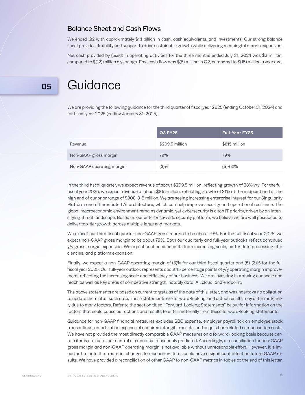 Q2 FY2025 Letter to SharehoLderSSENTINELONE 13 05 Balance Sheet and Cash Flows We ended Q2 with approximately $1.1 billion in cash, cash equivalents, and investments. Our strong balance sheet provides flexibility and support to drive sustainable growth while delivering meaningful margin expansion. Net cash provided by (used) in operating activities for the three months ended July 31, 2024 was $2 million, compared to $(12) million a year ago. Free cash flow was $(5) million in Q2, compared to $(15) million a year ago. Guidance We are providing the following guidance for the third quarter of fiscal year 2025 (ending October 31, 2024) and for fiscal year 2025 (ending January 31, 2025): Q3 FY25 Full-Year FY25 Revenue $209.5 million $815 million Non-GAAP gross margin 79% 79% Non-GAAP operating margin (3)% (5)-(3)% In the third fiscal quarter, we expect revenue of about $209.5 million, reflecting growth of 28% y/y. For the full fiscal year 2025, we expect revenue of about $815 million, reflecting growth of 31% at the midpoint and at the high end of our prior range of $808-815 million. We are seeing increasing enterprise interest for our Singularity Platform and differentiated AI architecture, which can help improve security and operational resilience. The global macroeconomic environment remains dynamic, yet cybersecurity is a top IT priority, driven by an inten- sifying threat landscape. Based on our enterprise-wide security platform, we believe we are well positioned to deliver top-tier growth across multiple large end markets. We expect our third fiscal quarter non-GAAP gross margin to be about 79%. For the full fiscal year 2025, we expect non-GAAP gross margin to be about 79%. Both our quarterly and full-year outlooks reflect continued y/y gross margin expansion. We expect continued benefits from increasing scale, better data processing effi- ciencies, and platform expansion. Finally, we expect a non-GAAP operating margin of (3)% for our third fiscal quarter and (5)-(3)% for the full fiscal year 2025. Our full-year outlook represents about 15 percentage points of y/y operating margin improve- ment, reflecting the increasing scale and efficiency of our business. We are investing in growing our scale and reach as well as key areas of competitive strength, notably data, AI, cloud, and endpoint. The above statements are based on current targets as of the date of this letter, and we undertake no obligation to update them after such date. These statements are forward-looking, and actual results may differ material- ly due to many factors. Refer to the section titled “Forward-Looking Statements” below for information on the factors that could cause our actions and results to differ materially from these forward-looking statements. Guidance for non-GAAP financial measures excludes SBC expense, employer payroll tax on employee stock transactions, amortization expense of acquired intangible assets, and acquisition-related compensation costs. We have not provided the most directly comparable GAAP measures on a forward-looking basis because cer- tain items are out of our control or cannot be reasonably predicted. Accordingly, a reconciliation for non-GAAP gross margin and non-GAAP operating margin is not available without unreasonable effort. However, it is im- portant to note that material changes to reconciling items could have a significant effect on future GAAP re- sults. We have provided a reconciliation of other GAAP to non-GAAP metrics in tables at the end of this letter.