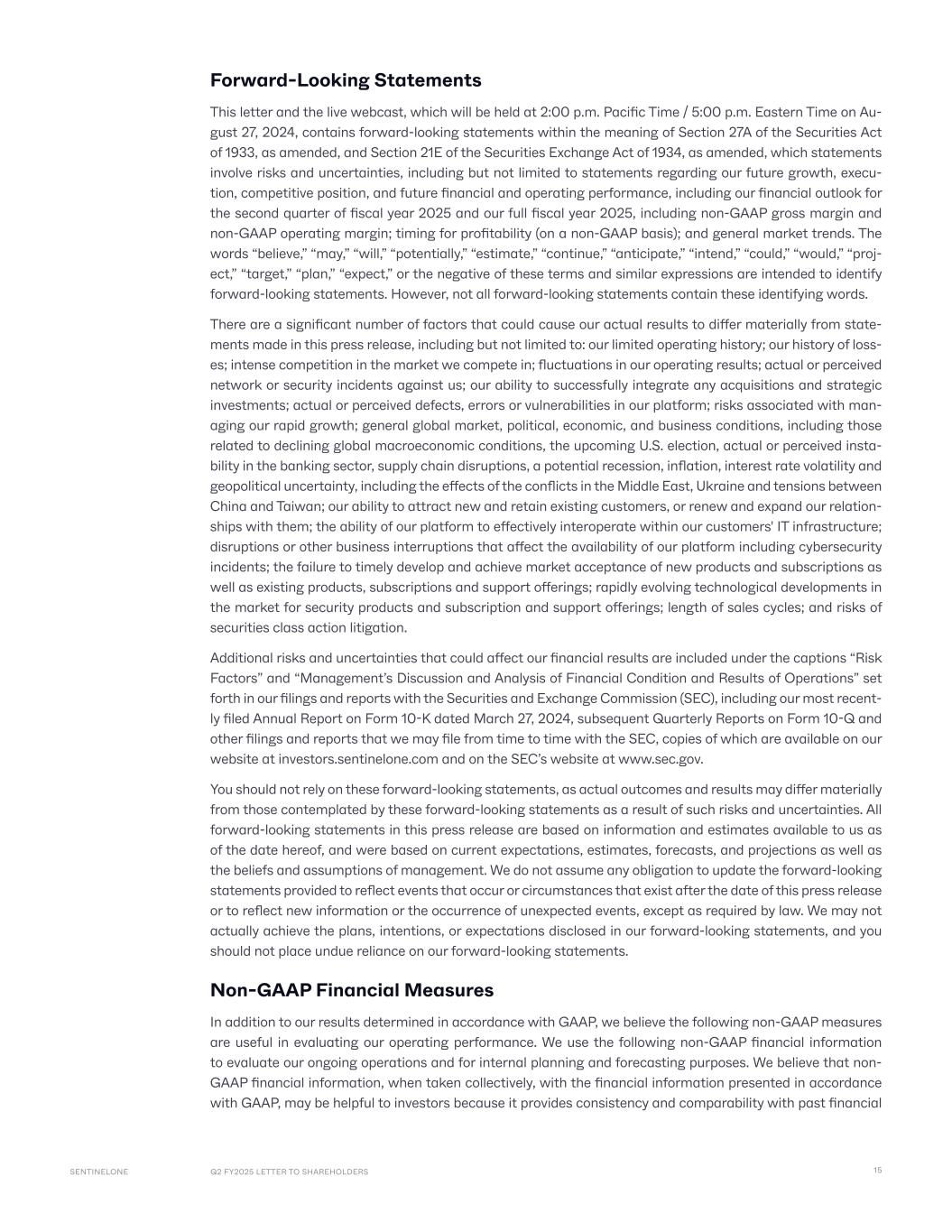Q2 FY2025 Letter to SharehoLderSSENTINELONE 15 Forward-Looking Statements This letter and the live webcast, which will be held at 2:00 p.m. Pacific Time / 5:00 p.m. Eastern Time on Au- gust 27, 2024, contains forward-looking statements within the meaning of Section 27A of the Securities Act of 1933, as amended, and Section 21E of the Securities Exchange Act of 1934, as amended, which statements involve risks and uncertainties, including but not limited to statements regarding our future growth, execu- tion, competitive position, and future financial and operating performance, including our financial outlook for the second quarter of fiscal year 2025 and our full fiscal year 2025, including non-GAAP gross margin and non-GAAP operating margin; timing for profitability (on a non-GAAP basis); and general market trends. The words “believe,” “may,” “will,” “potentially,” “estimate,” “continue,” “anticipate,” “intend,” “could,” “would,” “proj- ect,” “target,” “plan,” “expect,” or the negative of these terms and similar expressions are intended to identify forward-looking statements. However, not all forward-looking statements contain these identifying words. There are a significant number of factors that could cause our actual results to differ materially from state- ments made in this press release, including but not limited to: our limited operating history; our history of loss- es; intense competition in the market we compete in; fluctuations in our operating results; actual or perceived network or security incidents against us; our ability to successfully integrate any acquisitions and strategic investments; actual or perceived defects, errors or vulnerabilities in our platform; risks associated with man- aging our rapid growth; general global market, political, economic, and business conditions, including those related to declining global macroeconomic conditions, the upcoming U.S. election, actual or perceived insta- bility in the banking sector, supply chain disruptions, a potential recession, inflation, interest rate volatility and geopolitical uncertainty, including the effects of the conflicts in the Middle East, Ukraine and tensions between China and Taiwan; our ability to attract new and retain existing customers, or renew and expand our relation- ships with them; the ability of our platform to effectively interoperate within our customers' IT infrastructure; disruptions or other business interruptions that affect the availability of our platform including cybersecurity incidents; the failure to timely develop and achieve market acceptance of new products and subscriptions as well as existing products, subscriptions and support offerings; rapidly evolving technological developments in the market for security products and subscription and support offerings; length of sales cycles; and risks of securities class action litigation. Additional risks and uncertainties that could affect our financial results are included under the captions “Risk Factors” and “Management’s Discussion and Analysis of Financial Condition and Results of Operations” set forth in our filings and reports with the Securities and Exchange Commission (SEC), including our most recent- ly filed Annual Report on Form 10-K dated March 27, 2024, subsequent Quarterly Reports on Form 10-Q and other filings and reports that we may file from time to time with the SEC, copies of which are available on our website at investors.sentinelone.com and on the SEC’s website at www.sec.gov. You should not rely on these forward-looking statements, as actual outcomes and results may differ materially from those contemplated by these forward-looking statements as a result of such risks and uncertainties. All forward-looking statements in this press release are based on information and estimates available to us as of the date hereof, and were based on current expectations, estimates, forecasts, and projections as well as the beliefs and assumptions of management. We do not assume any obligation to update the forward-looking statements provided to reflect events that occur or circumstances that exist after the date of this press release or to reflect new information or the occurrence of unexpected events, except as required by law. We may not actually achieve the plans, intentions, or expectations disclosed in our forward-looking statements, and you should not place undue reliance on our forward-looking statements. Non-GAAP Financial Measures In addition to our results determined in accordance with GAAP, we believe the following non-GAAP measures are useful in evaluating our operating performance. We use the following non-GAAP financial information to evaluate our ongoing operations and for internal planning and forecasting purposes. We believe that non- GAAP financial information, when taken collectively, with the financial information presented in accordance with GAAP, may be helpful to investors because it provides consistency and comparability with past financial