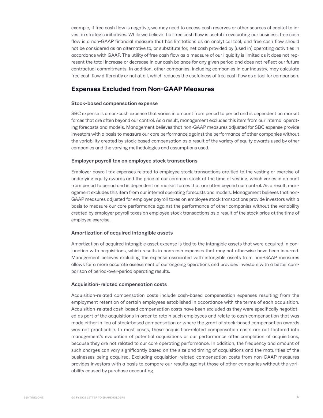 Q2 FY2025 Letter to SharehoLderSSENTINELONE 17 example, if free cash flow is negative, we may need to access cash reserves or other sources of capital to in- vest in strategic initiatives. While we believe that free cash flow is useful in evaluating our business, free cash flow is a non-GAAP financial measure that has limitations as an analytical tool, and free cash flow should not be considered as an alternative to, or substitute for, net cash provided by (used in) operating activities in accordance with GAAP. The utility of free cash flow as a measure of our liquidity is limited as it does not rep- resent the total increase or decrease in our cash balance for any given period and does not reflect our future contractual commitments. In addition, other companies, including companies in our industry, may calculate free cash flow differently or not at all, which reduces the usefulness of free cash flow as a tool for comparison. Expenses Excluded from Non-GAAP Measures Stock-based compensation expense SBC expense is a non-cash expense that varies in amount from period to period and is dependent on market forces that are often beyond our control. As a result, management excludes this item from our internal operat- ing forecasts and models. Management believes that non-GAAP measures adjusted for SBC expense provide investors with a basis to measure our core performance against the performance of other companies without the variability created by stock-based compensation as a result of the variety of equity awards used by other companies and the varying methodologies and assumptions used. Employer payroll tax on employee stock transactions Employer payroll tax expenses related to employee stock transactions are tied to the vesting or exercise of underlying equity awards and the price of our common stock at the time of vesting, which varies in amount from period to period and is dependent on market forces that are often beyond our control. As a result, man- agement excludes this item from our internal operating forecasts and models. Management believes that non- GAAP measures adjusted for employer payroll taxes on employee stock transactions provide investors with a basis to measure our core performance against the performance of other companies without the variability created by employer payroll taxes on employee stock transactions as a result of the stock price at the time of employee exercise. Amortization of acquired intangible assets Amortization of acquired intangible asset expense is tied to the intangible assets that were acquired in con- junction with acquisitions, which results in non-cash expenses that may not otherwise have been incurred. Management believes excluding the expense associated with intangible assets from non-GAAP measures allows for a more accurate assessment of our ongoing operations and provides investors with a better com- parison of period-over-period operating results. Acquisition-related compensation costs Acquisition-related compensation costs include cash-based compensation expenses resulting from the employment retention of certain employees established in accordance with the terms of each acquisition. Acquisition-related cash-based compensation costs have been excluded as they were specifically negotiat- ed as part of the acquisitions in order to retain such employees and relate to cash compensation that was made either in lieu of stock-based compensation or where the grant of stock-based compensation awards was not practicable. In most cases, these acquisition-related compensation costs are not factored into management's evaluation of potential acquisitions or our performance after completion of acquisitions, because they are not related to our core operating performance. In addition, the frequency and amount of such charges can vary significantly based on the size and timing of acquisitions and the maturities of the businesses being acquired. Excluding acquisition-related compensation costs from non-GAAP measures provides investors with a basis to compare our results against those of other companies without the vari- ability caused by purchase accounting.