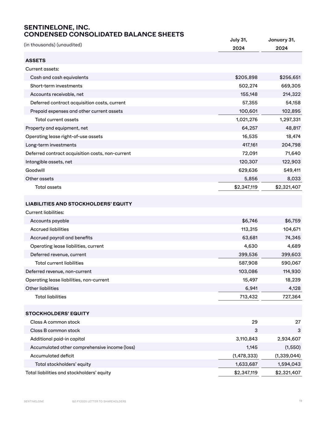 Q2 FY2025 Letter to SharehoLderSSENTINELONE 19 July 31, January 31, 2024 2024 ASSETS Current assets: Cash and cash equivalents $205,898 $256,651 Short-term investments 502,274 669,305 Accounts receivable, net 155,148 214,322 Deferred contract acquisition costs, current 57,355 54,158 Prepaid expenses and other current assets 100,601 102,895 Total current assets 1,021,276 1,297,331 Property and equipment, net 64,257 48,817 Operating lease right-of-use assets 16,535 18,474 Long-term investments 417,161 204,798 Deferred contract acquisition costs, non-current 72,091 71,640 Intangible assets, net 120,307 122,903 Goodwill 629,636 549,411 Other assets 5,856 8,033 Total assets $2,347,119 $2,321,407 LIABILITIES AND STOCKHOLDERS’ EQUITY Current liabilities: Accounts payable $6,746 $6,759 Accrued liabilities 113,315 104,671 Accrued payroll and benefits 63,681 74,345 Operating lease liabilities, current 4,630 4,689 Deferred revenue, current 399,536 399,603 Total current liabilities 587,908 590,067 Deferred revenue, non-current 103,086 114,930 Operating lease liabilities, non-current 15,497 18,239 Other liabilities 6,941 4,128 Total liabilities 713,432 727,364 STOCKHOLDERS’ EQUITY Class A common stock 29 27 Class B common stock 3 3 Additional paid-in capital 3,110,843 2,934,607 Accumulated other comprehensive income (loss) 1,145 (1,550) Accumulated deficit (1,478,333) (1,339,044) Total stockholders’ equity 1,633,687 1,594,043 Total liabilities and stockholders’ equity $2,347,119 $2,321,407 SENTINELONE, INC. CONDENSED CONSOLIDATED BALANCE SHEETS (in thousands) (unaudited)