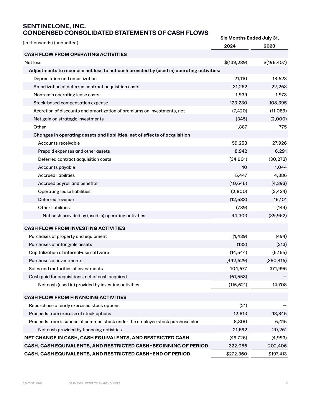 Q2 FY2025 Letter to SharehoLderSSENTINELONE 21 Six Months Ended July 31, 2024 2023 CASH FLOW FROM OPERATING ACTIVITIES Net loss $(139,289) $(196,407) Adjustments to reconcile net loss to net cash provided by (used in) operating activities: Depreciation and amortization 21,110 18,623 Amortization of deferred contract acquisition costs 31,252 22,263 Non-cash operating lease costs 1,939 1,973 Stock-based compensation expense 123,230 108,395 Accretion of discounts and amortization of premiums on investments, net (7,420) (11,089) Net gain on strategic investments (345) (2,000) Other 1,887 775 Changes in operating assets and liabilities, net of effects of acquisition Accounts receivable 59,258 27,926 Prepaid expenses and other assets 8,942 6,291 Deferred contract acquisition costs (34,901) (30,272) Accounts payable 10 1,044 Accrued liabilities 5,447 4,386 Accrued payroll and benefits (10,645) (4,393) Operating lease liabilities (2,800) (2,434) Deferred revenue (12,583) 15,101 Other liabilities (789) (144) Net cash provided by (used in) operating activities 44,303 (39,962) CASH FLOW FROM INVESTING ACTIVITIES Purchases of property and equipment (1,439) (494) Purchases of intangible assets (133) (213) Capitalization of internal-use software (14,544) (6,165) Purchases of investments (442,629) (350,416) Sales and maturities of investments 404,677 371,996 Cash paid for acquisitions, net of cash acquired (61,553) — Net cash (used in) provided by investing activities (115,621) 14,708 CASH FLOW FROM FINANCING ACTIVITIES Repurchase of early exercised stock options (21) — Proceeds from exercise of stock options 12,813 13,845 Proceeds from issuance of common stock under the employee stock purchase plan 8,800 6,416 Net cash provided by financing activities 21,592 20,261 NET CHANGE IN CASH, CASH EQUIVALENTS, AND RESTRICTED CASH (49,726) (4,993) CASH, CASH EQUIVALENTS, AND RESTRICTED CASH–BEGINNING OF PERIOD 322,086 202,406 CASH, CASH EQUIVALENTS, AND RESTRICTED CASH–END OF PERIOD $272,360 $197,413 SENTINELONE, INC. CONDENSED CONSOLIDATED STATEMENTS OF CASH FLOWS (in thousands) (unaudited)