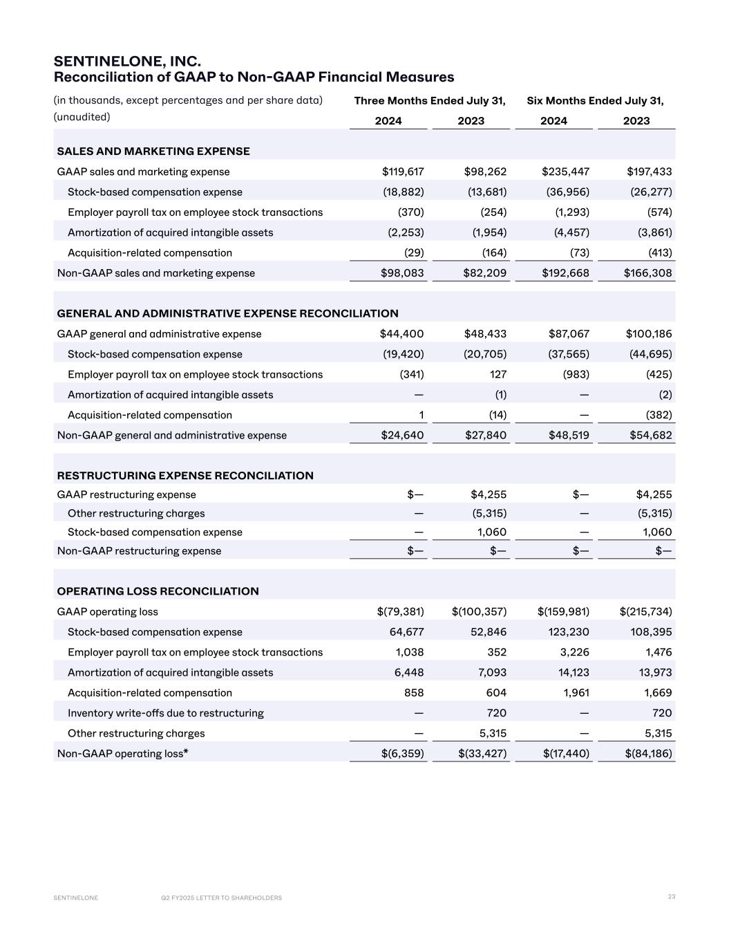 Q2 FY2025 Letter to SharehoLderSSENTINELONE 23 Three Months Ended July 31, Six Months Ended July 31, 2024 2023 2024 2023 SALES AND MARKETING EXPENSE GAAP sales and marketing expense $119,617 $98,262 $235,447 $197,433 Stock-based compensation expense (18,882) (13,681) (36,956) (26,277) Employer payroll tax on employee stock transactions (370) (254) (1,293) (574) Amortization of acquired intangible assets (2,253) (1,954) (4,457) (3,861) Acquisition-related compensation (29) (164) (73) (413) Non-GAAP sales and marketing expense $98,083 $82,209 $192,668 $166,308 GENERAL AND ADMINISTRATIVE EXPENSE RECONCILIATION GAAP general and administrative expense $44,400 $48,433 $87,067 $100,186 Stock-based compensation expense (19,420) (20,705) (37,565) (44,695) Employer payroll tax on employee stock transactions (341) 127 (983) (425) Amortization of acquired intangible assets — (1) — (2) Acquisition-related compensation 1 (14) — (382) Non-GAAP general and administrative expense $24,640 $27,840 $48,519 $54,682 RESTRUCTURING EXPENSE RECONCILIATION GAAP restructuring expense $— $4,255 $— $4,255 Other restructuring charges — (5,315) — (5,315) Stock-based compensation expense — 1,060 — 1,060 Non-GAAP restructuring expense $— $— $— $— OPERATING LOSS RECONCILIATION GAAP operating loss $(79,381) $(100,357) $(159,981) $(215,734) Stock-based compensation expense 64,677 52,846 123,230 108,395 Employer payroll tax on employee stock transactions 1,038 352 3,226 1,476 Amortization of acquired intangible assets 6,448 7,093 14,123 13,973 Acquisition-related compensation 858 604 1,961 1,669 Inventory write-offs due to restructuring — 720 — 720 Other restructuring charges — 5,315 — 5,315 Non-GAAP operating loss* $(6,359) $(33,427) $(17,440) $(84,186) SENTINELONE, INC. Reconciliation of GAAP to Non-GAAP Financial Measures (in thousands, except percentages and per share data) (unaudited)