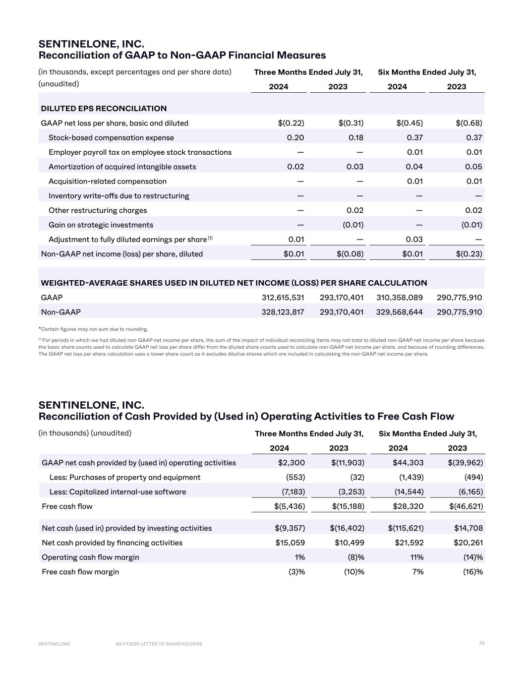 Q2 FY2025 Letter to SharehoLderSSENTINELONE 25 Three Months Ended July 31, Six Months Ended July 31, 2024 2023 2024 2023 DILUTED EPS RECONCILIATION GAAP net loss per share, basic and diluted $(0.22) $(0.31) $(0.45) $(0.68) Stock-based compensation expense 0.20 0.18 0.37 0.37 Employer payroll tax on employee stock transactions — — 0.01 0.01 Amortization of acquired intangible assets 0.02 0.03 0.04 0.05 Acquisition-related compensation — — 0.01 0.01 Inventory write-offs due to restructuring — — — — Other restructuring charges — 0.02 — 0.02 Gain on strategic investments — (0.01) — (0.01) Adjustment to fully diluted earnings per share (1) 0.01 — 0.03 — Non-GAAP net income (loss) per share, diluted $0.01 $(0.08) $0.01 $(0.23) WEIGHTED-AVERAGE SHARES USED IN DILUTED NET INCOME (LOSS) PER SHARE CALCULATION GAAP 312,615,531 293,170,401 310,358,089 290,775,910 Non-GAAP 328,123,817 293,170,401 329,568,644 290,775,910 Three Months Ended July 31, Six Months Ended July 31, 2024 2023 2024 2023 GAAP net cash provided by (used in) operating activities $2,300 $(11,903) $44,303 $(39,962) Less: Purchases of property and equipment (553) (32) (1,439) (494) Less: Capitalized internal-use software (7,183) (3,253) (14,544) (6,165) Free cash flow $(5,436) $(15,188) $28,320 $(46,621) Net cash (used in) provided by investing activities $(9,357) $(16,402) $(115,621) $14,708 Net cash provided by financing activities $15,059 $10,499 $21,592 $20,261 Operating cash flow margin 1% (8)% 11% (14)% Free cash flow margin (3)% (10)% 7% (16)% SENTINELONE, INC. Reconciliation of Cash Provided by (Used in) Operating Activities to Free Cash Flow (in thousands) (unaudited) SENTINELONE, INC. Reconciliation of GAAP to Non-GAAP Financial Measures (in thousands, except percentages and per share data) (unaudited) *Certain figures may not sum due to rounding. (1) For periods in which we had diluted non-GAAP net income per share, the sum of the impact of individual reconciling items may not total to diluted non-GAAP net income per share because the basic share counts used to calculate GAAP net loss per share differ from the diluted share counts used to calculate non-GAAP net income per share, and because of rounding differences. The GAAP net loss per share calculation uses a lower share count as it excludes dilutive shares which are included in calculating the non-GAAP net income per share.