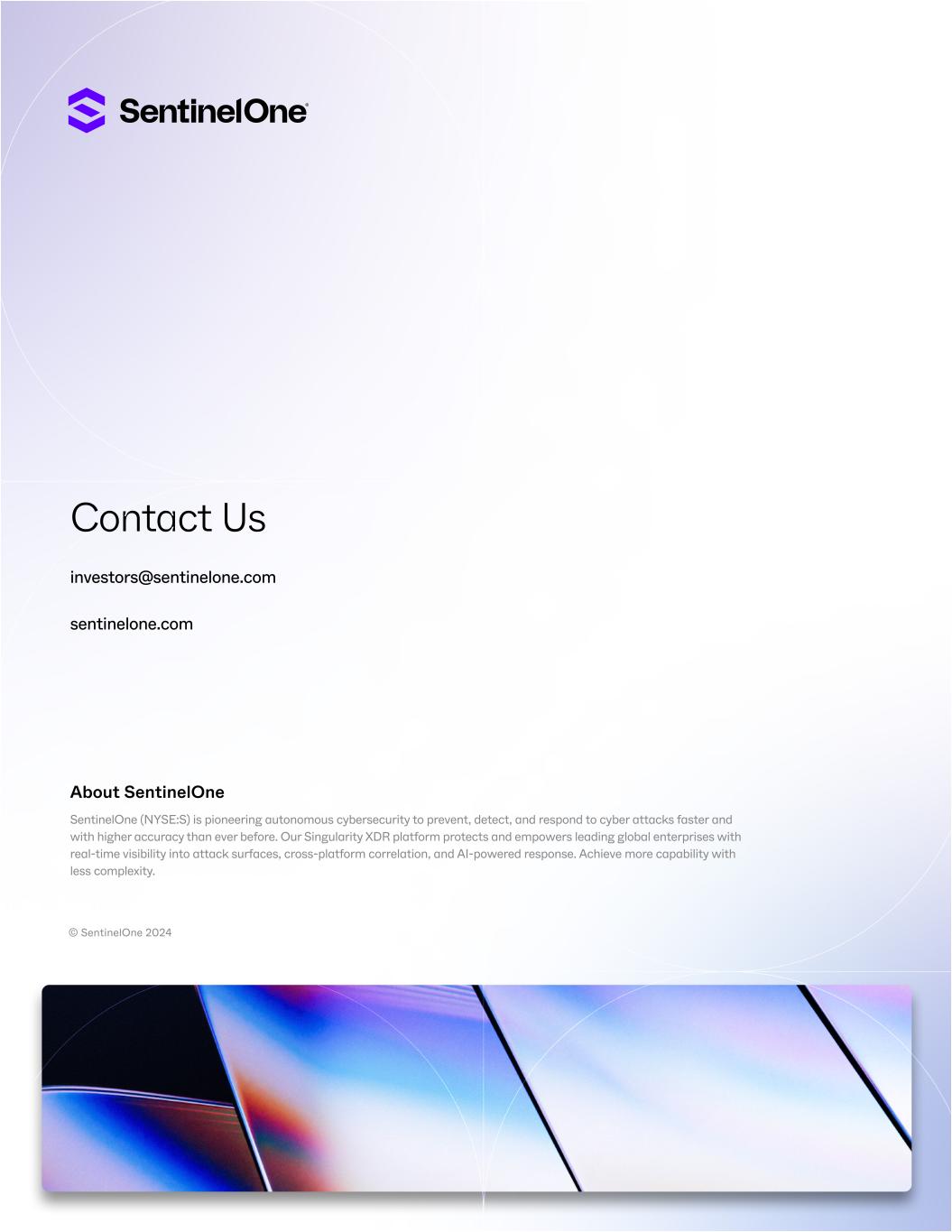 Contact Us investors@sentinelone.com sentinelone.com © Sentinelone 2024 About SentinelOne Sentinelone (NYSe:S) is pioneering autonomous cybersecurity to prevent, detect, and respond to cyber attacks faster and with higher accuracy than ever before. our Singularity Xdr platform protects and empowers leading global enterprises with real-time visibility into attack surfaces, cross-platform correlation, and aI-powered response. achieve more capability with less complexity.