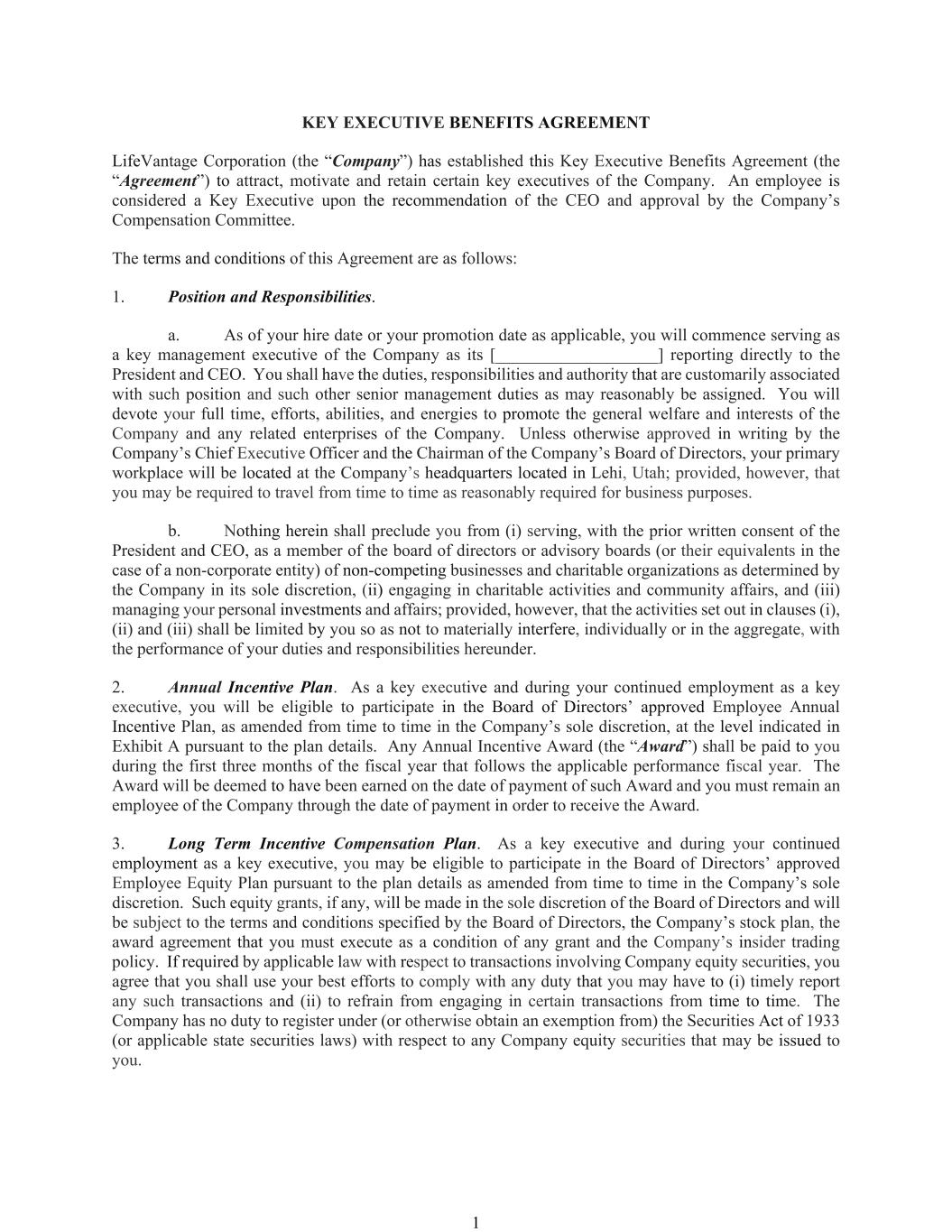 LIFEVANTAGE CORPORATION POLICY FOR THE