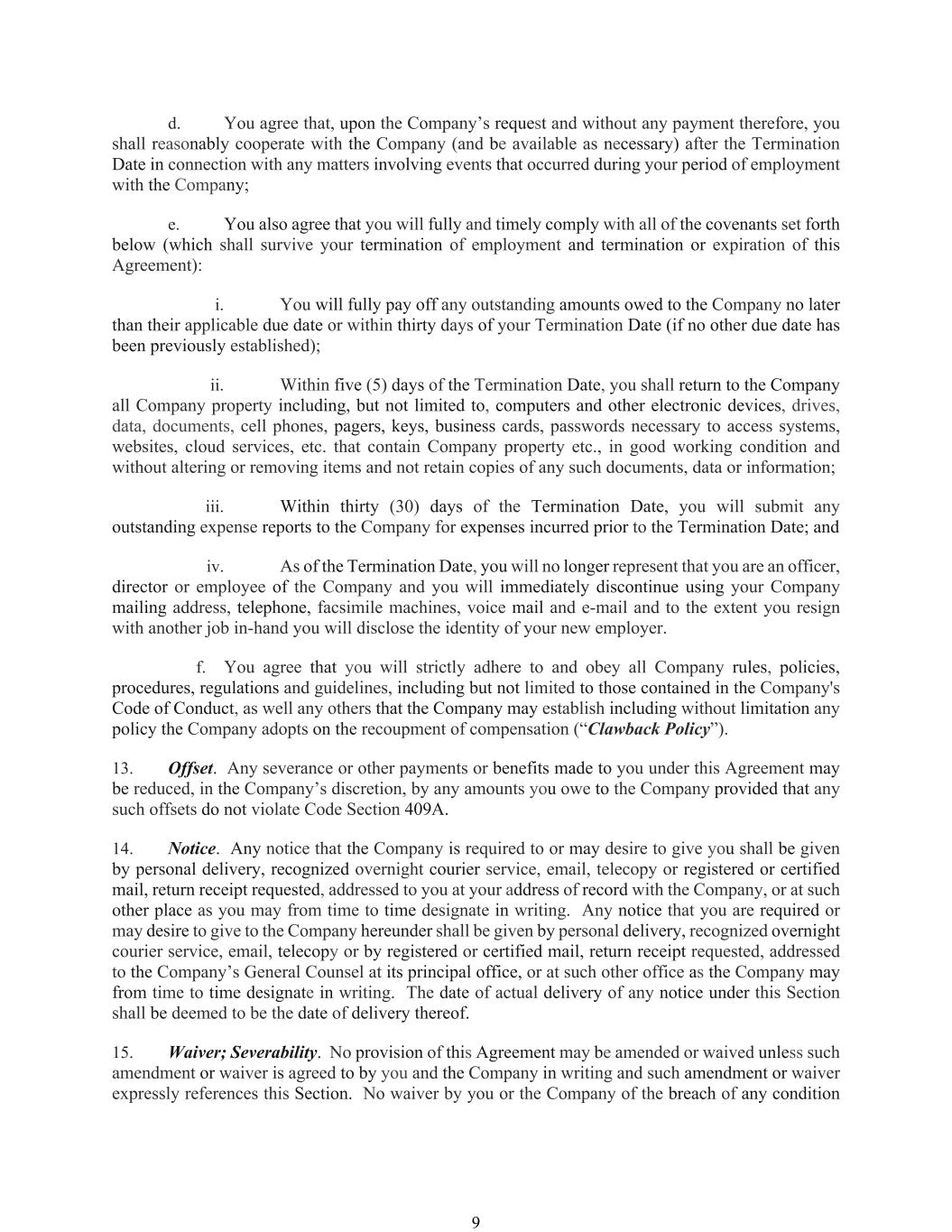 9. Amendment; Termination. The Committee may amend, modify, supplement, rescind or replace all or any portion of this Policy at any time and from time to time in its discretion and shall amend this Policy as it deems necessary, including as and when it determines that it is legally required by any federal securities laws, SEC rule or the rules of any national securities exchange or national securities association on which the Company’s securities are listed. The Committee may terminate this Policy at any time. Notwithstanding anything in this Section 9 to the contrary, no amendment or termination of this Policy shall be effective if such amendment or termination would (after taking into account any actions taken by the Company contemporaneously with such amendment or termination) cause the Company to violate any federal securities laws, SEC rule or the rules of any national securities exchange or national securities association on which the Company’s securities are listed.