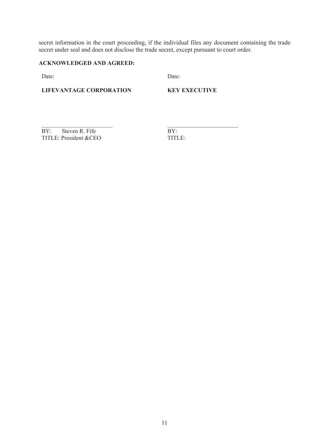 By signing below, the undersigned acknowledges and confirms that the undersigned has received and reviewed a copy of the LifeVantage Corporation Policy for the Recovery of Erroneously Awarded Compensation (as may be amended, restated, supplemented or otherwise modified from time to time, the “Policy”). Capitalized terms used but not otherwise defined in this Acknowledgment Form (this “Acknowledgment Form”) shall have the meanings ascribed to such terms in the Policy.
