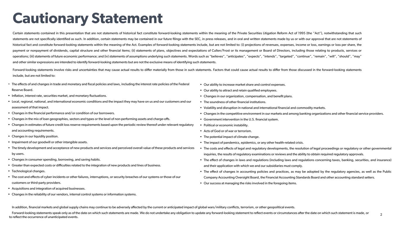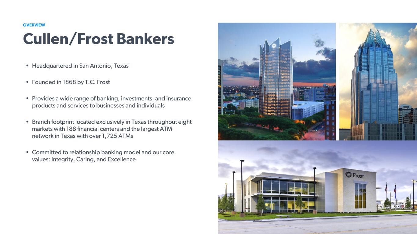 2 Cautionary Statement Certain statements contained in this presentation that are not statements of historical fact constitute forward-looking statements within the meaning of the Private Securities Litigation Reform Act of 1995 (the “Act”), notwithstanding that such statements are not specifically identified as such. In addition, certain statements may be contained in our future filings with the SEC, in press releases, and in oral and written statements made by us or with our approval that are not statements of historical fact and constitute forward-looking statements within the meaning of the Act. Examples of forward-looking statements include, but are not limited to: (i) projections of revenues, expenses, income or loss, earnings or loss per share, the payment or nonpayment of dividends, capital structure and other financial items; (ii) statements of plans, objectives and expectations of Cullen/Frost or its management or Board of Directors, including those relating to products, services or operations; (iii) statements of future economic performance; and (iv) statements of assumptions underlying such statements. Words such as “believes”, “anticipates”, “expects”, “intends”, “targeted”, “continue”, “remain”, “will”, “should”, “may” and other similar expressions are intended to identify forward-looking statements but are not the exclusive means of identifying such statements. Forward-looking statements involve risks and uncertainties that may cause actual results to differ materially from those in such statements. Factors that could cause actual results to differ from those discussed in the forward-looking statements include, but are not limited to: In addition, financial markets and global supply chains may continue to be adversely affected by the current or anticipated impact of global wars/military conflicts, terrorism, or other geopolitical events. Forward-looking statements speak only as of the date on which such statements are made. We do not undertake any obligation to update any forward-looking statement to reflect events or circumstances after the date on which such statement is made, or to reflect the occurrence of unanticipated events. • Our ability to increase market share and control expenses. • Our ability to attract and retain qualified employees. • Changes in our organization, compensation, and benefit plans. • The soundness of other financial institutions. • Volatility and disruption in national and international financial and commodity markets. • Changes in the competitive environment in our markets and among banking organizations and other financial service providers. • Government intervention in the U.S. financial system. • Political or economic instability. • Acts of God or of war or terrorism. • The potential impact of climate change. • The impact of pandemics, epidemics, or any other health-related crisis. • The costs and effects of legal and regulatory developments, the resolution of legal proceedings or regulatory or other governmental inquiries, the results of regulatory examinations or reviews and the ability to obtain required regulatory approvals. • The effect of changes in laws and regulations (including laws and regulations concerning taxes, banking, securities, and insurance) and their application with which we and our subsidiaries must comply. • The effect of changes in accounting policies and practices, as may be adopted by the regulatory agencies, as well as the Public Company Accounting Oversight Board, the Financial Accounting Standards Board and other accounting standard setters. • Our success at managing the risks involved in the foregoing items. • The effects of and changes in trade and monetary and fiscal policies and laws, including the interest rate policies of the Federal Reserve Board. • Inflation, interest rate, securities market, and monetary fluctuations. • Local, regional, national, and international economic conditions and the impact they may have on us and our customers and our assessment of that impact. • Changes in the financial performance and/or condition of our borrowers. • Changes in the mix of loan geographies, sectors and types or the level of non-performing assets and charge-offs. • Changes in estimates of future credit loss reserve requirements based upon the periodic review thereof under relevant regulatory and accounting requirements. • Changes in our liquidity position. • Impairment of our goodwill or other intangible assets. • The timely development and acceptance of new products and services and perceived overall value of these products and services by users. • Changes in consumer spending, borrowing, and saving habits. • Greater than expected costs or difficulties related to the integration of new products and lines of business. • Technological changes. • The cost and effects of cyber incidents or other failures, interruptions, or security breaches of our systems or those of our customers or third-party providers. • Acquisitions and integration of acquired businesses. • Changes in the reliability of our vendors, internal control systems or information systems.