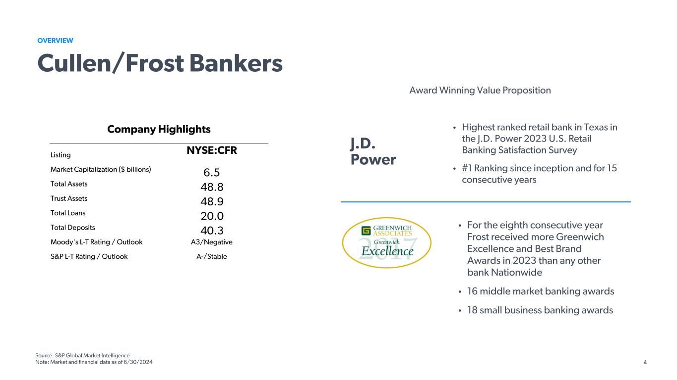 3 OVERVIEW Cullen/Frost Bankers • Headquartered in San Antonio, Texas • Founded in 1868 by T.C. Frost • Provides a wide range of banking, investments, and insurance products and services to businesses and individuals • Branch footprint located exclusively in Texas throughout eight markets with 188 financial centers and the largest ATM network in Texas with over 1,725 ATMs • Committed to relationship banking model and our core values: Integrity, Caring, and Excellence