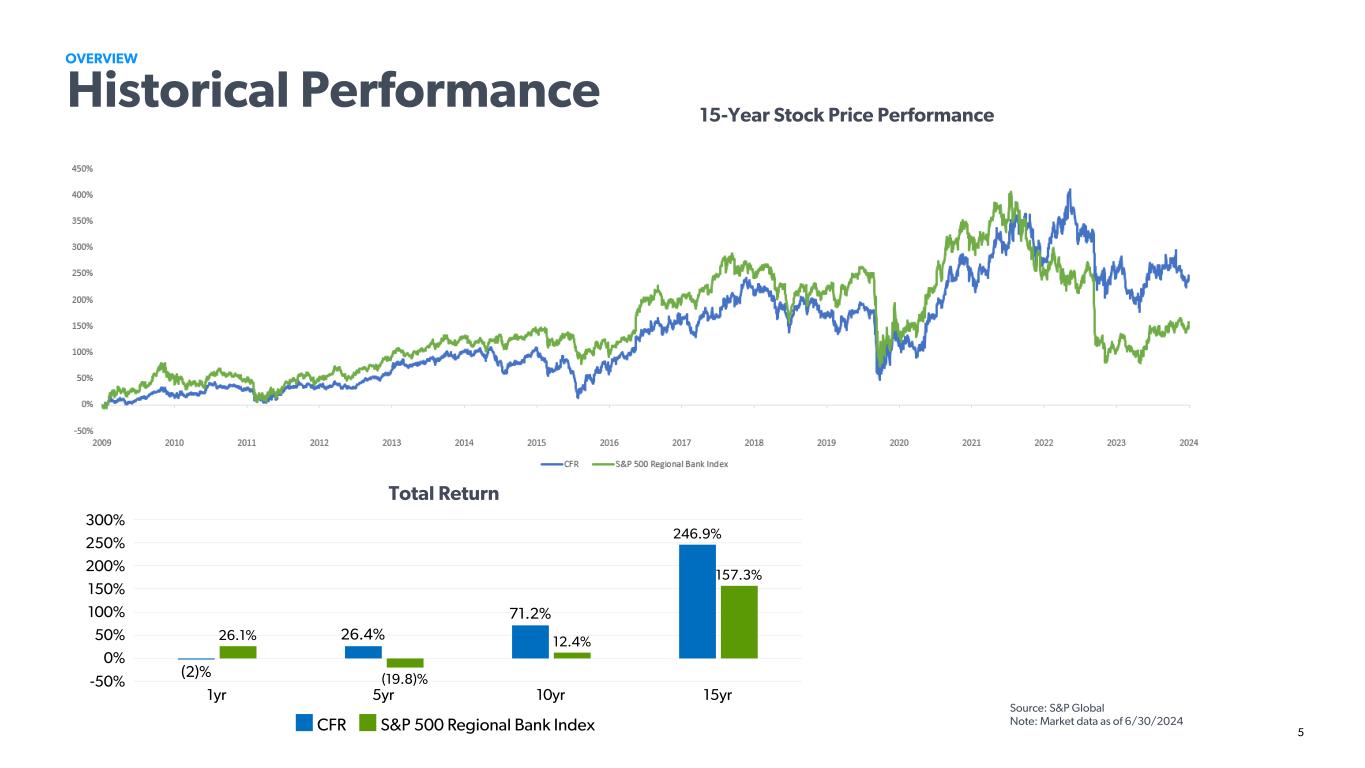 4 OVERVIEW Cullen/Frost Bankers Source: S&P Global Market Intelligence Note: Market and financial data as of 6/30/2024 Award Winning Value Proposition J.D. Power Company Highlights Listing NYSE:CFR Market Capitalization ($ billions) 6.5 Total Assets 48.8 Trust Assets 48.9 Total Loans 20.0 Total Deposits 40.3 Moody's L-T Rating / Outlook A3/Negative S&P L-T Rating / Outlook A-/Stable • Highest ranked retail bank in Texas in the J.D. Power 2023 U.S. Retail Banking Satisfaction Survey • #1 Ranking since inception and for 15 consecutive years • For the eighth consecutive year Frost received more Greenwich Excellence and Best Brand Awards in 2023 than any other bank Nationwide • 16 middle market banking awards • 18 small business banking awards