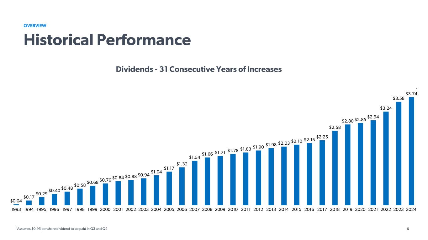 6 OVERVIEW Historical Performance Dividends - 31 Consecutive Years of Increases $0.04 $0.17 $0.29 $0.40 $0.48 $0.58 $0.68 $0.76 $0.84 $0.88 $0.94 $1.04 $1.17 $1.32 $1.54 $1.66 $1.71 $1.78 $1.83 $1.90 $1.98 $2.03 $2.10 $2.15 $2.25 $2.58 $2.80 $2.85 $2.94 $3.24 $3.58 $3.74 1993 1994 1995 1996 1997 1998 1999 2000 2001 2002 2003 2004 2005 2006 2007 2008 2009 2010 2011 2012 2013 2014 2015 2016 2017 2018 2019 2020 2021 2022 2023 2024 1Assumes $0.95 per share dividend to be paid in Q3 and Q4 1