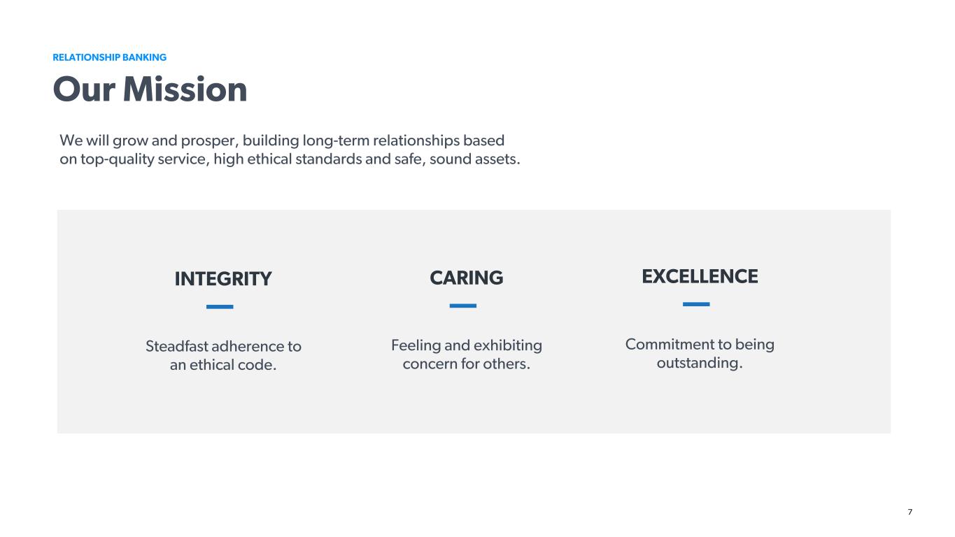 7 RELATIONSHIP BANKING Our Mission We will grow and prosper, building long-term relationships based on top-quality service, high ethical standards and safe, sound assets. INTEGRITY Steadfast adherence to an ethical code. CARING Feeling and exhibiting concern for others. EXCELLENCE Commitment to being outstanding.