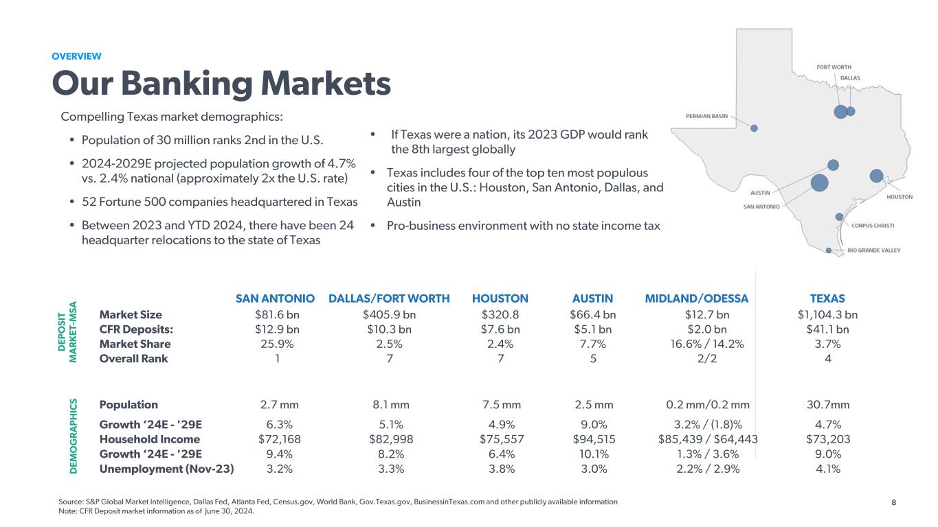 8 OVERVIEW Our Banking Markets Compelling Texas market demographics: • Population of 30 million ranks 2nd in the U.S. • 2024-2029E projected population growth of 4.7% vs. 2.4% national (approximately 2x the U.S. rate) • 52 Fortune 500 companies headquartered in Texas • Between 2023 and YTD 2024, there have been 24 headquarter relocations to the state of Texas SAN ANTONIO DALLAS/FORT WORTH HOUSTON AUSTIN MIDLAND/ODESSA TEXAS Market Size $81.6 bn $405.9 bn $320.8 $66.4 bn $12.7 bn $1,104.3 bn CFR Deposits: $12.9 bn $10.3 bn $7.6 bn $5.1 bn $2.0 bn $41.1 bn Market Share 25.9% 2.5% 2.4% 7.7% 16.6% / 14.2% 3.7% Overall Rank 1 7 7 5 2/2 4 D EP O SI T M A R K ET -M SA D EM O G R A P H IC S Source: S&P Global Market Intelligence, Dallas Fed, Atlanta Fed, Census.gov, World Bank, Gov.Texas.gov, BusinessinTexas.com and other publicly available information Note: CFR Deposit market information as of June 30, 2024. • If Texas were a nation, its 2023 GDP would rank the 8th largest globally • Texas includes four of the top ten most populous cities in the U.S.: Houston, San Antonio, Dallas, and Austin • Pro-business environment with no state income tax Population 2.7 mm 8.1 mm 7.5 mm 2.5 mm 0.2 mm/0.2 mm 30.7mm Growth ‘24E - '29E 6.3% 5.1% 4.9% 9.0% 3.2% / (1.8)% 4.7% Household Income $72,168 $82,998 $75,557 $94,515 $85,439 / $64,443 $73,203 Growth ‘24E - '29E 9.4% 8.2% 6.4% 10.1% 1.3% / 3.6% 9.0% Unemployment (Nov-23) 3.2% 3.3% 3.8% 3.0% 2.2% / 2.9% 4.1%