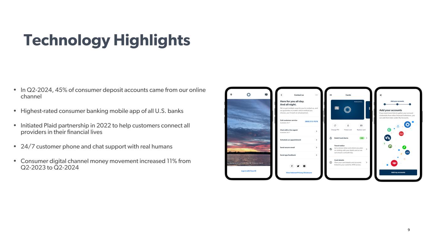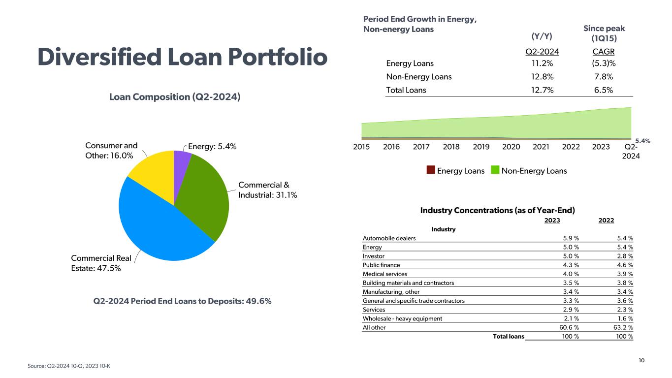 9 Technology Highlights • In Q2-2024, 45% of consumer deposit accounts came from our online channel • Highest-rated consumer banking mobile app of all U.S. banks • Initiated Plaid partnership in 2022 to help customers connect all providers in their financial lives • 24/7 customer phone and chat support with real humans • Consumer digital channel money movement increased 11% from Q2-2023 to Q2-2024