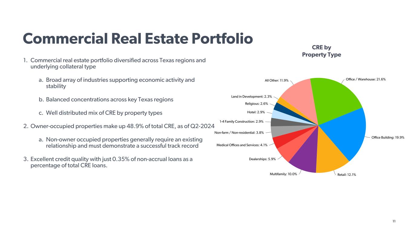 10 Diversified Loan Portfolio Period End Growth in Energy, Non-energy Loans Loan Composition (Q2-2024) Q2-2024 Period End Loans to Deposits: 49.6% Source: Q2-2024 10-Q, 2023 10-K Since peak (1Q15)(Y/Y) Q2-2024 CAGR Energy Loans 11.2% (5.3)% Non-Energy Loans 12.8% 7.8% Total Loans 12.7% 6.5% 5.4% Energy Loans Non-Energy Loans 2015 2016 2017 2018 2019 2020 2021 2022 2023 Q2- 2024 Energy: 5.4% Commercial & Industrial: 31.1% Commercial Real Estate: 47.5% Consumer and Other: 16.0% Industry Concentrations (as of Year-End) 2023 2022 Industry Automobile dealers 5.9 % 5.4 % Energy 5.0 % 5.4 % Investor 5.0 % 2.8 % Public finance 4.3 % 4.6 % Medical services 4.0 % 3.9 % Building materials and contractors 3.5 % 3.8 % Manufacturing, other 3.4 % 3.4 % General and specific trade contractors 3.3 % 3.6 % Services 2.9 % 2.3 % Wholesale - heavy equipment 2.1 % 1.6 % All other 60.6 % 63.2 % Total loans 100 % 100 %
