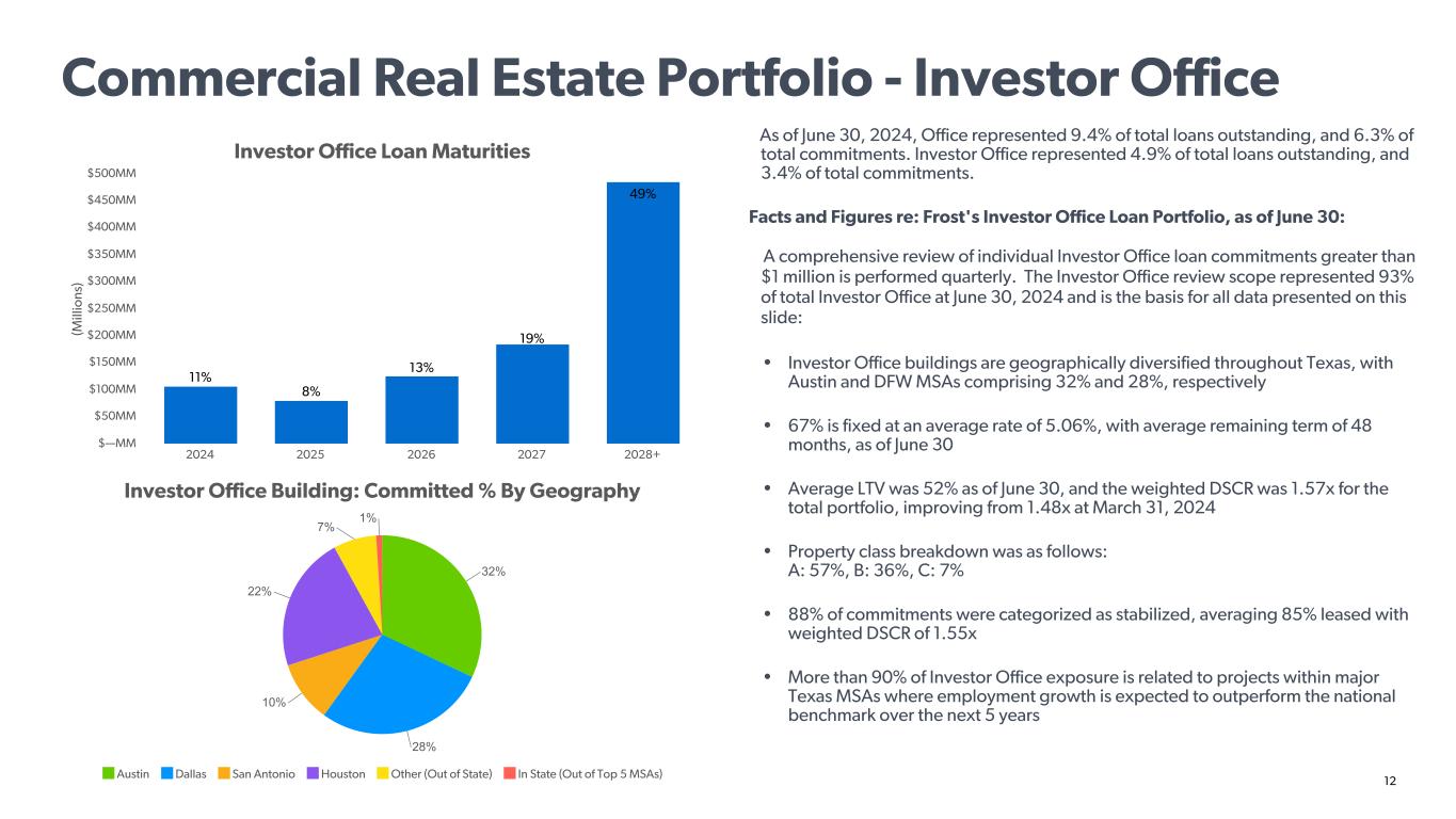 11 Commercial Real Estate Portfolio 1. Commercial real estate portfolio diversified across Texas regions and underlying collateral type a. Broad array of industries supporting economic activity and stability b. Balanced concentrations across key Texas regions c. Well distributed mix of CRE by property types 2. Owner-occupied properties make up 48.9% of total CRE, as of Q2-2024 a. Non-owner occupied properties generally require an existing relationship and must demonstrate a successful track record 3. Excellent credit quality with just 0.35% of non-accrual loans as a percentage of total CRE loans. CRE by Property Type Office / Warehouse: 21.6% Office Building: 19.9% Retail: 12.1%Multifamily: 10.0% Dealerships: 5.9% Medical Offices and Services: 4.1% Non-farm / Non-residential: 3.8% 1-4 Family Construction: 2.9% Hotel: 2.9% Religious: 2.6% Land in Development: 2.3% All Other: 11.9%