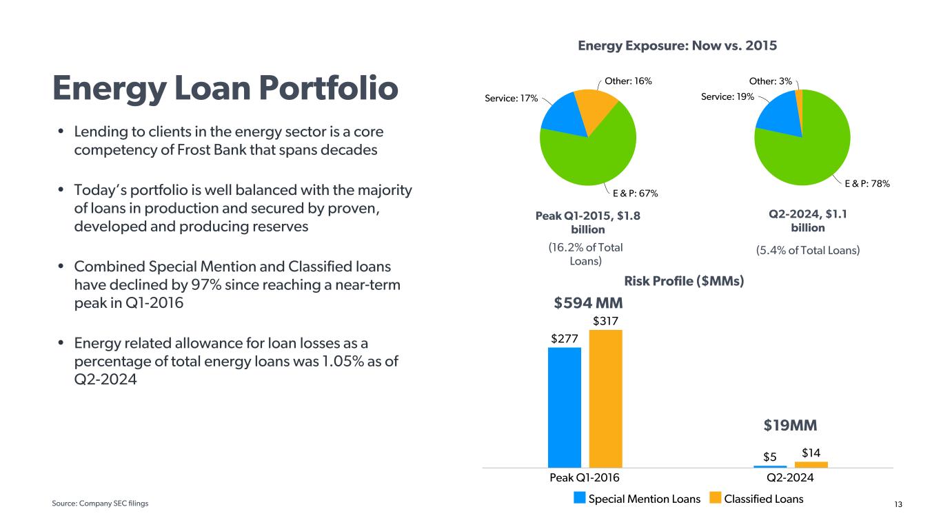12 Commercial Real Estate Portfolio - Investor Office As of June 30, 2024, Office represented 9.4% of total loans outstanding, and 6.3% of total commitments. Investor Office represented 4.9% of total loans outstanding, and 3.4% of total commitments. Facts and Figures re: Frost's Investor Office Loan Portfolio, as of June 30: A comprehensive review of individual Investor Office loan commitments greater than $1 million is performed quarterly. The Investor Office review scope represented 93% of total Investor Office at June 30, 2024 and is the basis for all data presented on this slide: • Investor Office buildings are geographically diversified throughout Texas, with Austin and DFW MSAs comprising 32% and 28%, respectively • 67% is fixed at an average rate of 5.06%, with average remaining term of 48 months, as of June 30 • Average LTV was 52% as of June 30, and the weighted DSCR was 1.57x for the total portfolio, improving from 1.48x at March 31, 2024 • Property class breakdown was as follows: A: 57%, B: 36%, C: 7% • 88% of commitments were categorized as stabilized, averaging 85% leased with weighted DSCR of 1.55x • More than 90% of Investor Office exposure is related to projects within major Texas MSAs where employment growth is expected to outperform the national benchmark over the next 5 years Investor Office Building: Committed % By Geography 32% 28% 10% 22% 7% 1% Austin Dallas San Antonio Houston Other (Out of State) In State (Out of Top 5 MSAs) (M ill io ns ) Investor Office Loan Maturities 11% 8% 13% 19% 49% 2024 2025 2026 2027 2028+ $—MM $50MM $100MM $150MM $200MM $250MM $300MM $350MM $400MM $450MM $500MM