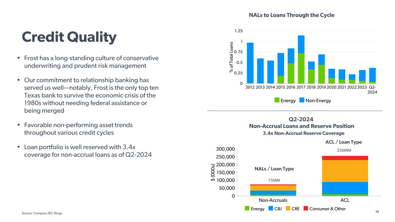 13 $277 $5 $317 $14 Special Mention Loans Classified Loans Peak Q1-2016 Q2-2024 Energy Loan Portfolio • Lending to clients in the energy sector is a core competency of Frost Bank that spans decades • Today’s portfolio is well balanced with the majority of loans in production and secured by proven, developed and producing reserves • Combined Special Mention and Classified loans have declined by 97% since reaching a near-term peak in Q1-2016 • Energy related allowance for loan losses as a percentage of total energy loans was 1.05% as of Q2-2024 Energy Exposure: Now vs. 2015 Peak Q1-2015, $1.8 billion Q2-2024, $1.1 billion (5.4% of Total Loans)(16.2% of Total Loans) $594 MM E & P: 67% Service: 17% Other: 16% E & P: 78% Service: 19% Other: 3% Risk Profile ($MMs) $19MM Source: Company SEC filings