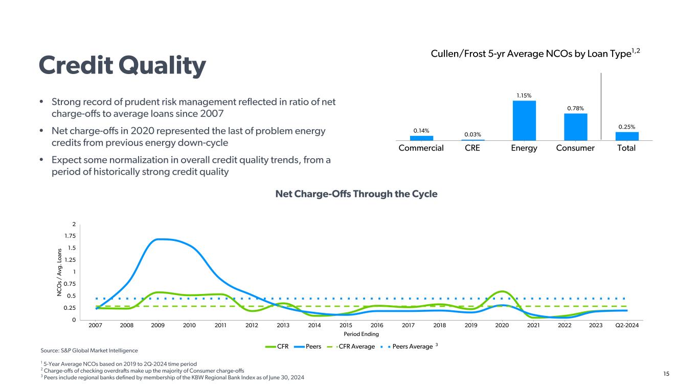 14 $ (0 0 0 s) Energy C&I CRE Consumer & Other Non-Accruals ACL 0 50,000 100,000 150,000 200,000 250,000 300,000 Credit Quality • Frost has a long-standing culture of conservative underwriting and prudent risk management • Our commitment to relationship banking has served us well—notably, Frost is the only top ten Texas bank to survive the economic crisis of the 1980s without needing federal assistance or being merged • Favorable non-performing asset trends throughout various credit cycles • Loan portfolio is well reserved with 3.4x coverage for non-accrual loans as of Q2-2024 NALs to Loans Through the Cycle Q2-2024 Non-Accrual Loans and Reserve Position ACL / Loan Type NALs / Loan Type 3.4x Non-Accrual Reserve Coverage 75MM 256MM % o f T ot al L oa ns Energy Non-Energy 2012 2013 2014 2015 2016 2017 2018 2019 2020 2021 2022 2023 Q2- 2024 0 0.25 0.5 0.75 1 1.25 Source: Company SEC filings