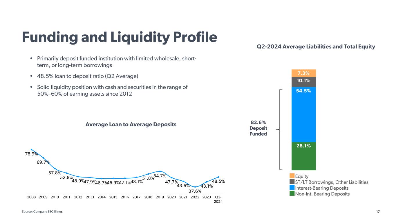 16 13.35% 13.82% 15.27% 8.62% 12.30% 12.70% 14.67% 9.86% Common Equity Tier 1 Tier 1 Capital Total Capital Tier 1 Leverage Strong Capital Position Cullen/Frost Capital Ratios as of June 30, 2024 . Frost Bank maintains the capacity to pay $1.1 billion of dividends to Cullen/Frost 1 CFR Q2-2024 Regulatory Q2-2024 Regional Banks 2 Minimum Capital 3 Source: S&P Global Market Intelligence 1 Under applicable regulatory dividend restrictions, and while maintaining its “well capitalized” status, Frost Bank could pay aggregate dividends of approximately $1.1 billion to Cullen/Frost, without obtaining affirmative governmental approvals, at June 30, 2024 2 Regional banks defined by membership of the KBW Regional Bank Index as of June 30, 2024 3 The Basel III Capital Rules require Cullen/Frost and Frost Bank to maintain an additional capital conservation buffer of 2.5% of CET1, effectively resulting in minimum ratios of (i) CET1 to risk-weighted assets of at least 7%, (ii) Tier 1 capital to risk-weighted assets of at least 8.5%, (iii) a minimum ratio of Total capital to risk-weighted assets of at least 10.5%; and (iv) a minimum leverage ratio of 4% 4.0% 10.5% 8.5% 7.0%