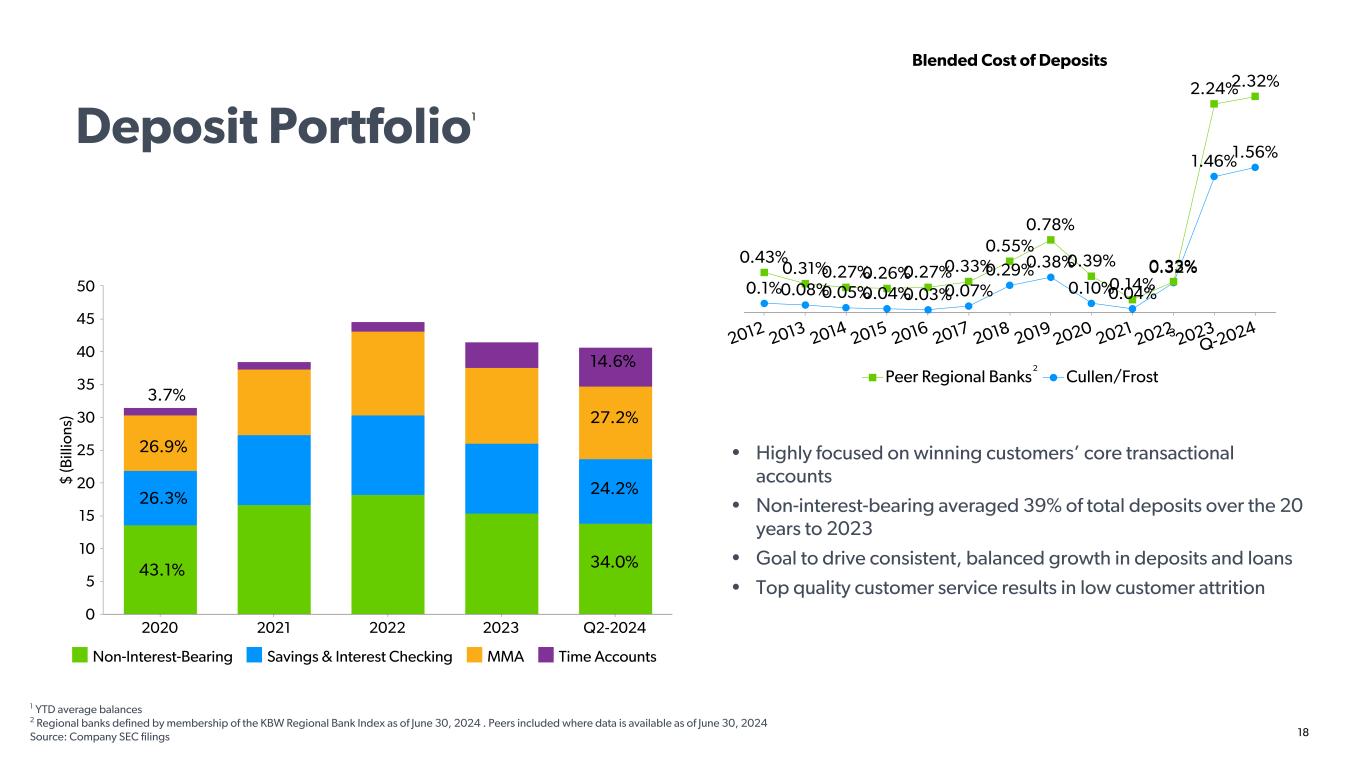 17 Funding and Liquidity Profile • Primarily deposit funded institution with limited wholesale, short- term, or long-term borrowings • 48.5% loan to deposit ratio (Q2 Average) • Solid liquidity position with cash and securities in the range of 50%–60% of earning assets since 2012 Q2-2024 Average Liabilities and Total Equity Average Loan to Average Deposits 82.6% Deposit Funded • 1 Ratio of cash and cash equivalents and securities to total earning assets for 2018 was 55% 78.9% 69.7% 57.8% 52.8% 48.9%47.9%46.7%46.9%47.1%48.1% 51.8%54.7% 47.7% 43.6% 37.6% 43.1% 48.5% 2008 2009 2010 2011 2012 2013 2014 2015 2016 2017 2018 2019 2020 2021 2022 2023 Q2- 2024 28.1% 54.5% 10.1% 7.3% Equity ST/LT Borrowings, Other Liabilities Interest-Bearing Deposits Non-Int. Bearing Deposits Source: Company SEC filings